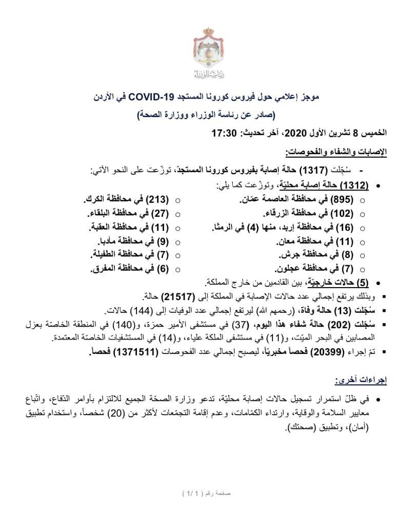 13 وفاة و 1312 إصابة جديدة سُجلت اليوم On أكتوبر 8, 2020 Share وكالة الناس – موجز إعلامي حول فيروس كورونا المستجد COVID-19 في الأردن (صادر عن رئاسة الوزراء ووزارة الصحة) الخميس 8 تشرين الأول 2020.