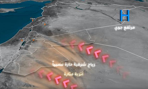 رياح شرقية إلى جنوبية شرقية مثيرة للغبار اعتبارا من الجمعة، مع امتداد منخفض البحر الأحمر نحو المنطقة، وارتفاع قيم الضغط الجوي فوق العراق، تهب على المملكة رياح شرقية حارة نسبيا و جافة، تكون معتدلة السرعة مع هبات نشطة أحيانا ومثيرة للأتربة والغبار في عموم مناطق المملكة خلال عطلة نهاية الاسبوع.