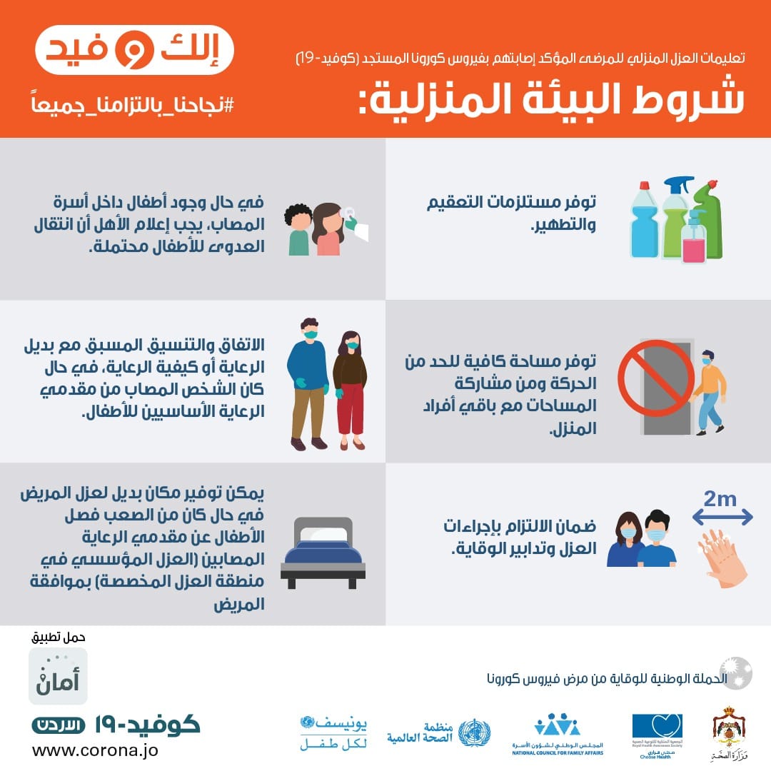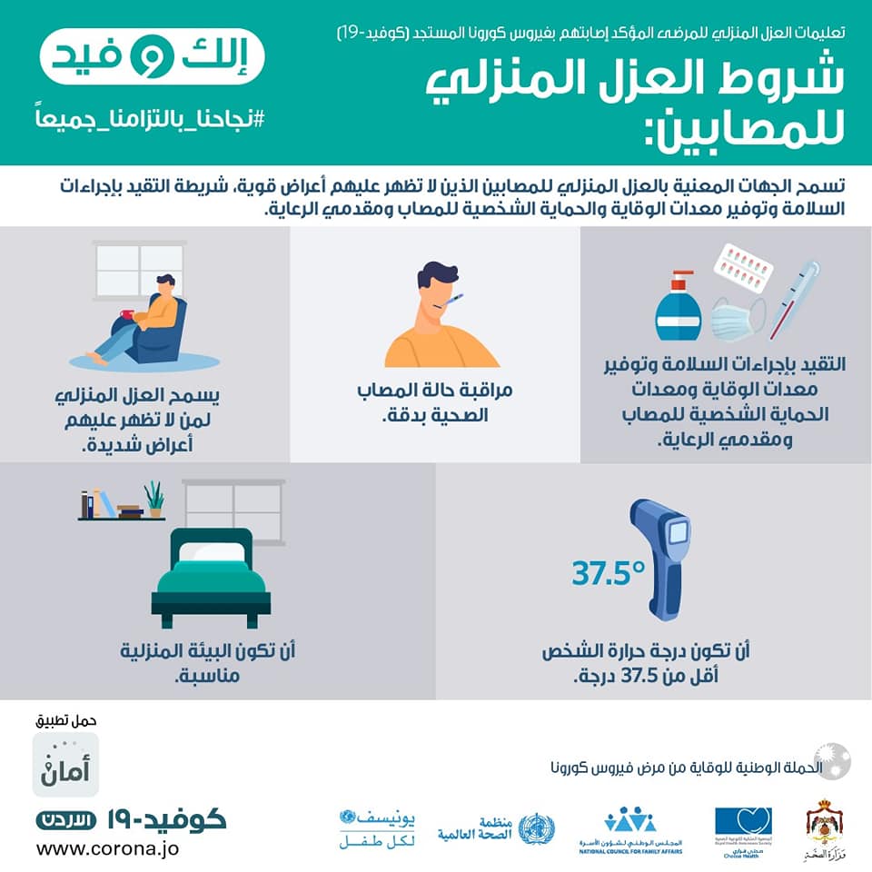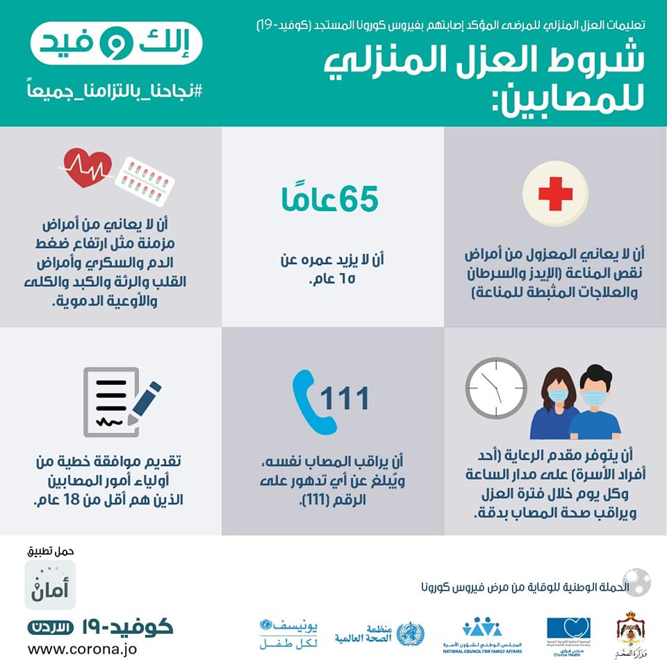 وبينت أنه في حال كان المنزل مناسباً يقوم المعنيين بالمتابعة والرصد النشط ومتابعة المخالطين ومتابعته كل يوم، وتضمنت التعليمات شروط العزل المنزلي، وأهمها، أن لا يزيد عمر المريض عن 65 عاما، والتقيد بإجراءات ضبط العدوى والسلامة العامة وضمان الامدادات الكافيٌة لمعدات الحماٌية الشخصية المناسبة لكل من المرضى ومقدمي الرعايٌة الصحٌية، والمراقبة الدقيقية لاي علامات او اعراض تدهور في حالتهم الصحية.