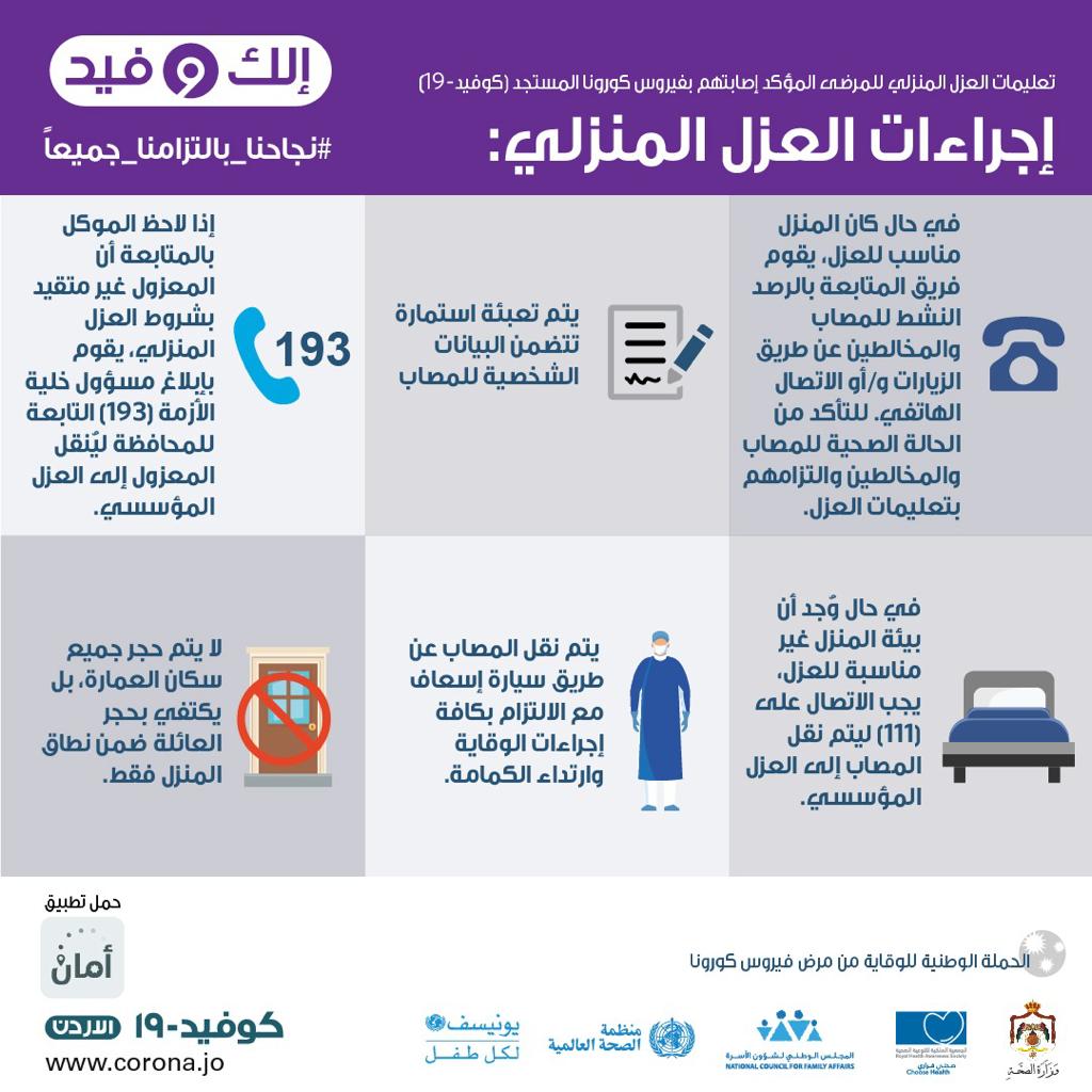 واذا لاحظ الطبيب او الشخص الموكل له المتابعة، أن الشخص المعزول في المنزل غير متقيد يتم ابلاغ خلية الازمة في المحافظة على الرقم 193 لاتخاذ الاجراءات القانونية اللازمة، وبينت الوزارة انه اذا كان الشخص المصاب يسكن ضمن عمارة مؤلفة من شقق سكنية فلا يتم حجر سكان العمارة بل يكتفي بحجر العائلة ضمن نطاق المنزل، كما يتم تطبيق الإجراءات على القادمين بالحجر المنزلي بنفس الشروط.