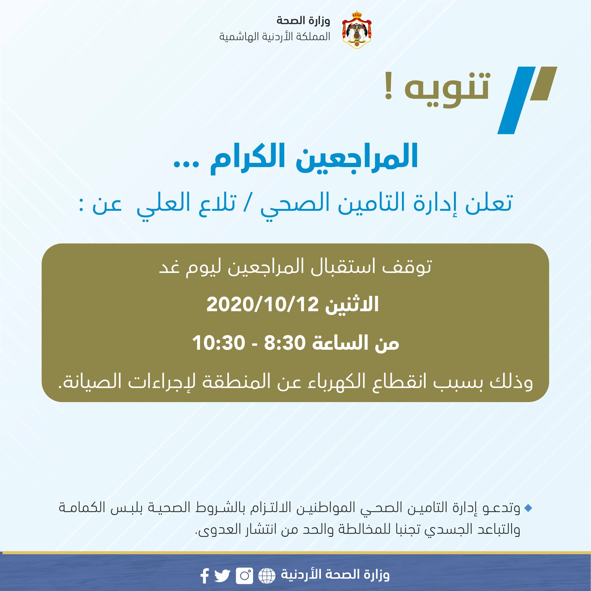 الصحة: توقف إدارة التأمين الصحي عن استقبال المراجعين (صورة) On أكتوبر 11, 2020 Share وكالة الناس – اعلنت ادارة التامين الصحي / تلاع العلي عن توقف استقبال المراجعين ليوم غد الاثنين 12/10/2020 من الساعة الثامنة والنصف وحتى الساعة العاشرة والنصف صباحا، وذلك سبب انقطاع الكهرباء عن المنطقة لاجراءات الصيانة.