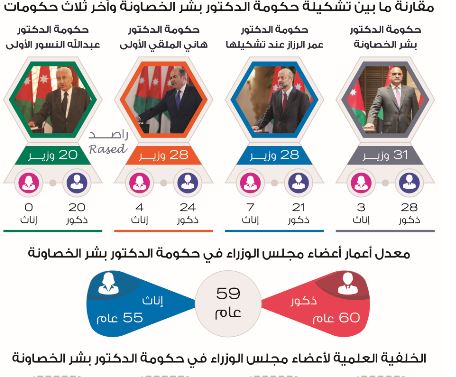 وكالة الناس – نفذ برنامج راصد لمراقبة الأداء الحكومي تحليلاً حول تشكيلة حكومة الدكتور بشر الخصاونة وأظهر التحليل أن الحكومة تشكلت من 31 وزيراً منهم 3 سيدات بنسبة 9% من مجموع أعضاء الحكومة، مقارنة بـ 28 وزيراً منهم 7 سيدات في حكومة الدكتور عمر الرزاز الأولى، و28 وزيراً منهم 4 سيدات في تشكيلة حكومة الدكتور هاني الملقي الأولى، و20 وزيراً دون وجود أي سيدة في حكومة الدكتور عبد الله النسور الأولى.