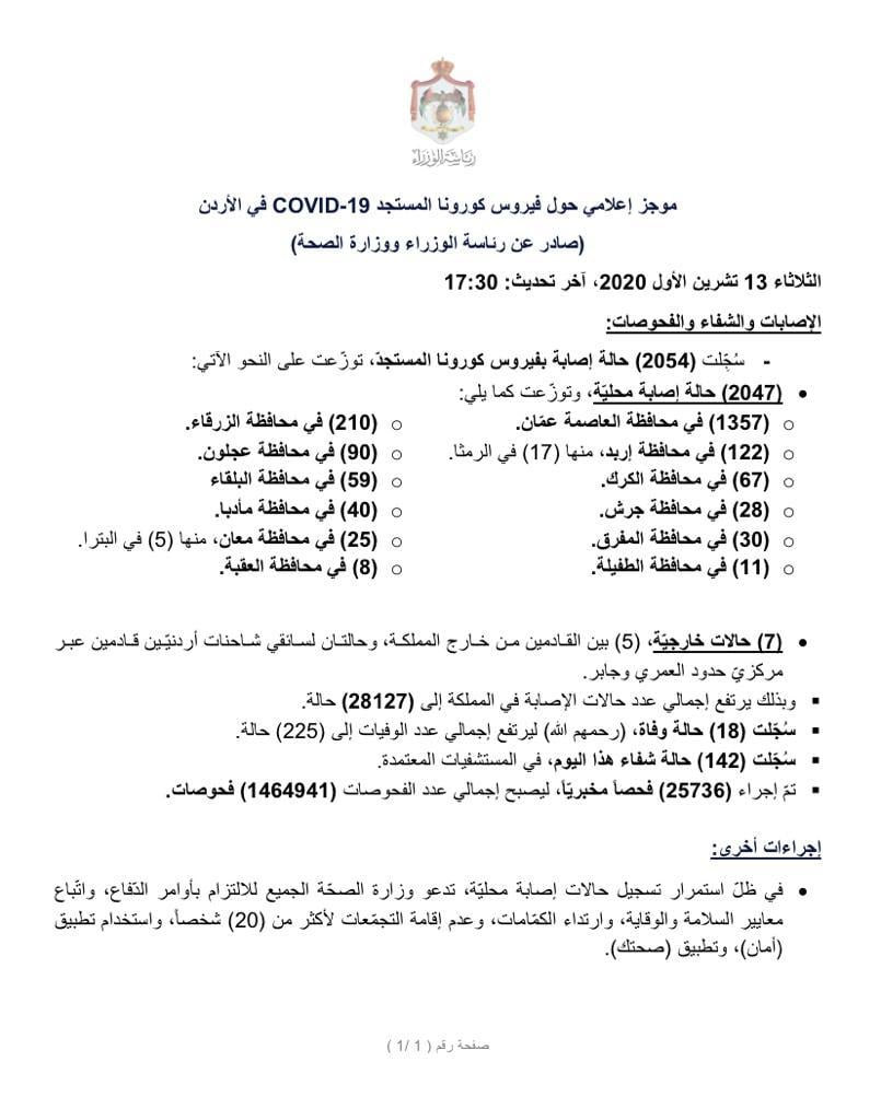 تسجيل 18 وفة و 2054 إصابة جديدة بكورونا On أكتوبر 13, 2020 Share وكالة الناس – موجز إعلامي حول فيروس كورونا المستجد COVID-19 في الأردن (صادر عن رئاسة الوزراء ووزارة الصحة).