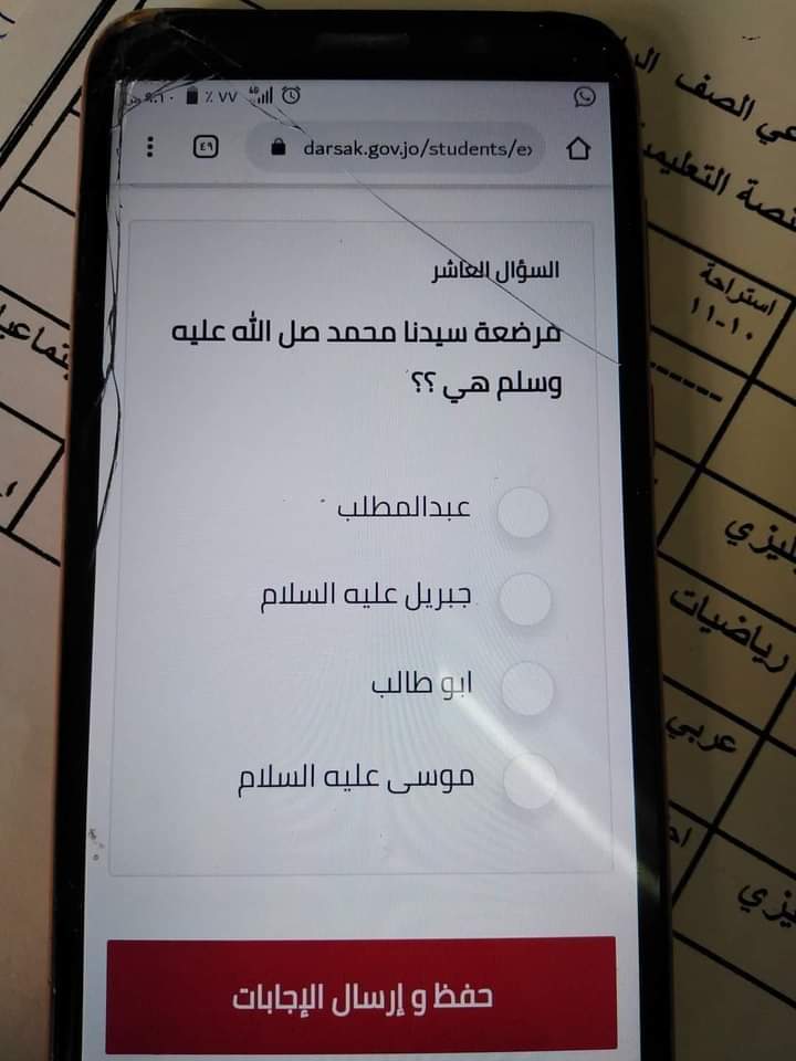 وكالة الناس – نفت وزارة التربية والتعليم أن يكون ما تم تداوله حول أحد الأسئلة في اختبار هذا اليوم والمتعلق بمرضعة سيدنا محمد صلى الله عليه وسلم من الأسئلة التي بُثت على منصة درسك، حيث إن اختبارات هذا اليوم خاصة بمادة العلوم للصفوف من الثاني الأساسي ولغاية الثامن والفيزياء للصفين التاسع والعاشر ولا يوجد اختبار لمادة التربية الإسلامية.