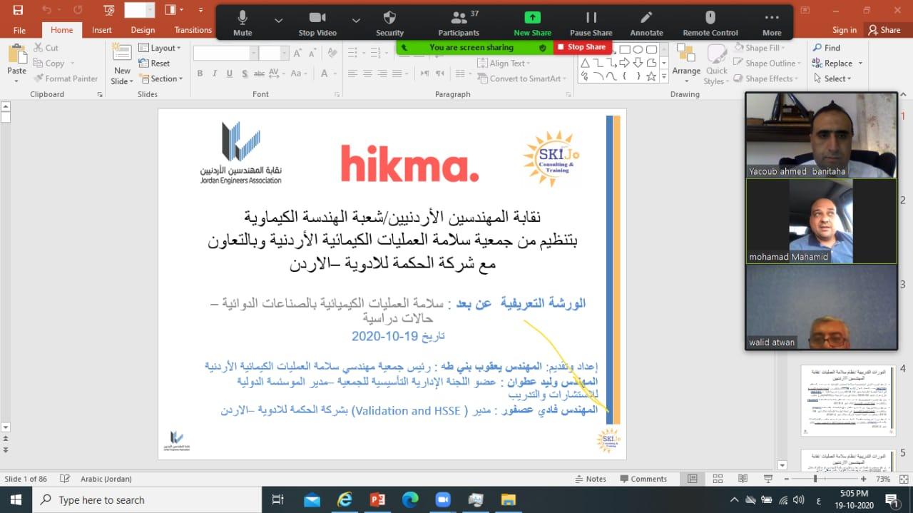 وكالة الناس – نظمت جمعية سلامة العمليات الكيميائية الاردنية بشعبة الهندسة الكيميائية في نقابة المهندسين الأردنيين، والتعاون مع دائرة السلامة والصحة المهنية والبيئة والمصادقة في شركة الحكمة –الأردن، ورشة عمل متخصصة عن بعد بعنوان (سلامة العمليات بالصناعات الدوائية– حالات دراسية) ومقدمة لنظام ادارة سلامة العمليات الكيميائية حسب المركز الأمريكي لسلامة العمليات، بمشاركة 55 من الزملاء المهندسين والمهندسات والكيميائيين في الشركات الصناعية الدوائية الأردنية.