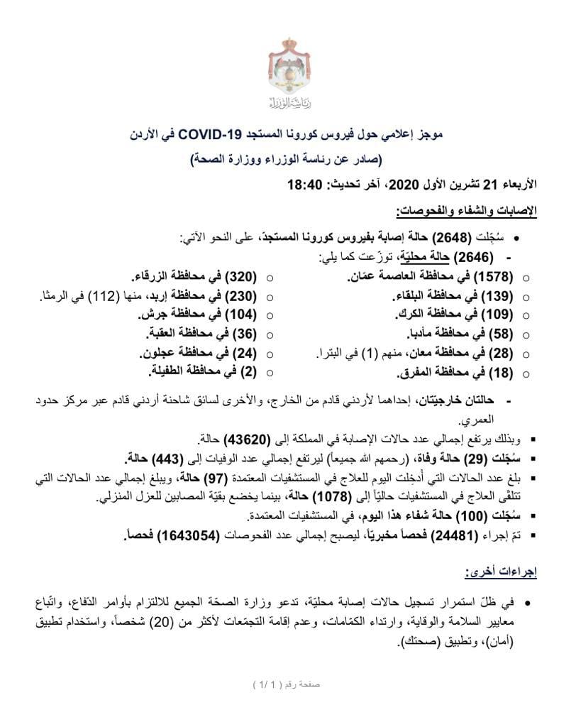 وكالة الناس – موجز إعلامي حول فيروس كورونا المستجد COVID-19 في الأردن (صادر عن رئاسة الوزراء ووزارة الصحة) الأربعاء 21 تشرين الأول 2020.