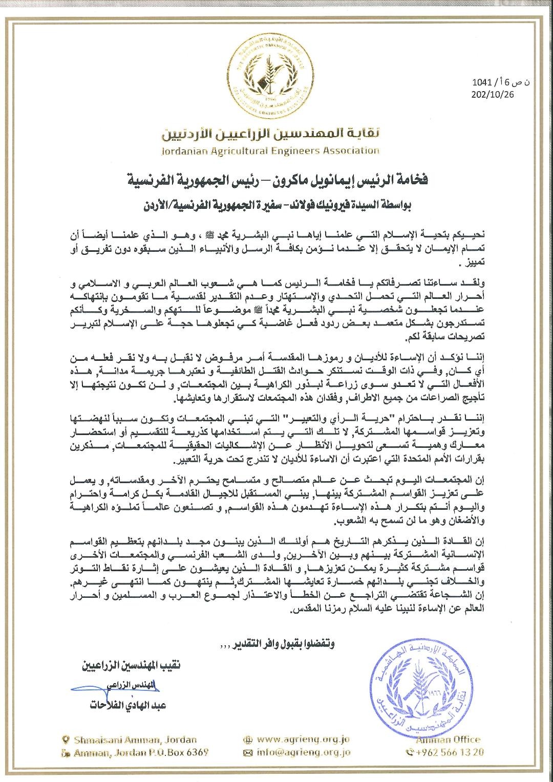 وكالة الناس – وجه المهندسين الزراعيين لـ ماكرون – رئيس الجمهورية الفرنسية بواسطة السيدة فيرونيك فولاند- سفير ة الجمهورية الفرنسية/الأردن، بيان خطابي استنكارا لما صرح به عن الإساءة للرسول عليه افضل الصلاة والسلام، وطالبوه بالاعتذار للعرب والمسلمين واحرار العالم، وتالياً نص الخطاب: