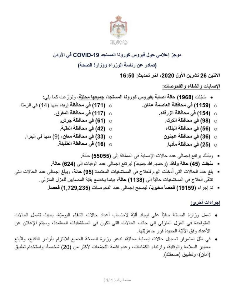 وكالة الناس – موجز إعلامي حول فيروس كورونا المستجد COVID-19 في الأردن (صادر عن رئاسة الوزراء ووزارة الصحة) الاثنين 26 تشرين الأول 2020.