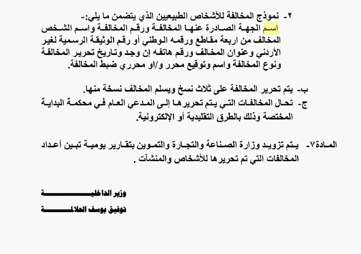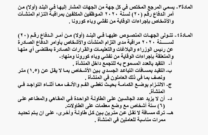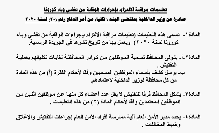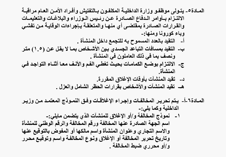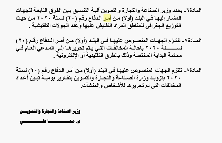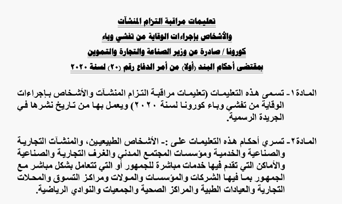 وعممت وزارة الصناعة والتجارة، تعليمات مراقبة التزام المنشآت والأشخاص بإجراءات الوقاية من تفشي وباء كورونا، كما أصدر وزير الداخلية، تعليمات مراقبة الالتزام بإجراءات الوقاية من تفشي وباء كورونا.