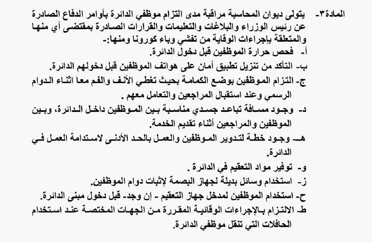من جهته، أصدر رئيس ديوان المحاسبة تعليمات الرقابة على التزام موظفي الوزارات والدوائـــر الحكوميـــة والمؤسسات الرسمية العامة والمؤسسات العامة بإجراءات الوقاية من تفشي وباء كورونا.
