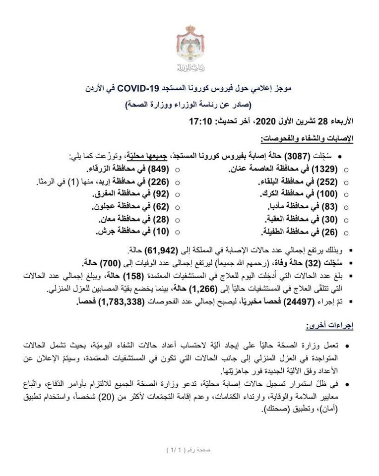 وكالة الناس – موجز إعلامي حول فيروس كورونا المستجد COVID-19 في الأردن (صادر عن رئاسة الوزراء ووزارة الصحة) الأربعاء 28 تشرين الأول 2020.
