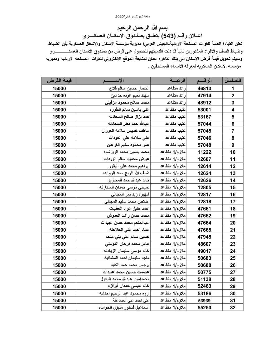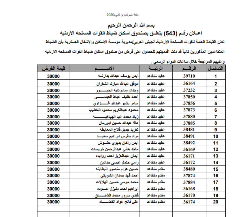 وكالة الناس – أعلنت القيادة العامة للقوات المسلحة الأردنية الجيش العربي مديرية مؤسسة الإسكان والأشغال العسكرية بان الضباط وضباط الصف والأفراد المبينة أسماءهم أدناه قد دنت اقدميتهم للحصول على قرض من صناديق الإسكان العسكري.