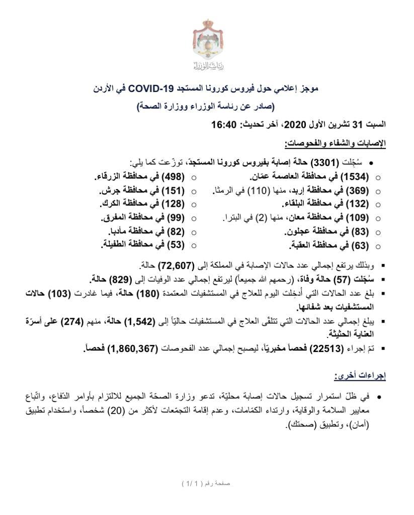 وكالة الناس – موجز إعلامي حول فيروس كورونا المستجد COVID-19 في الأردن (صادر عن رئاسة الوزراء ووزارة الصحة) السبت 31 تشرين الأول 2020.