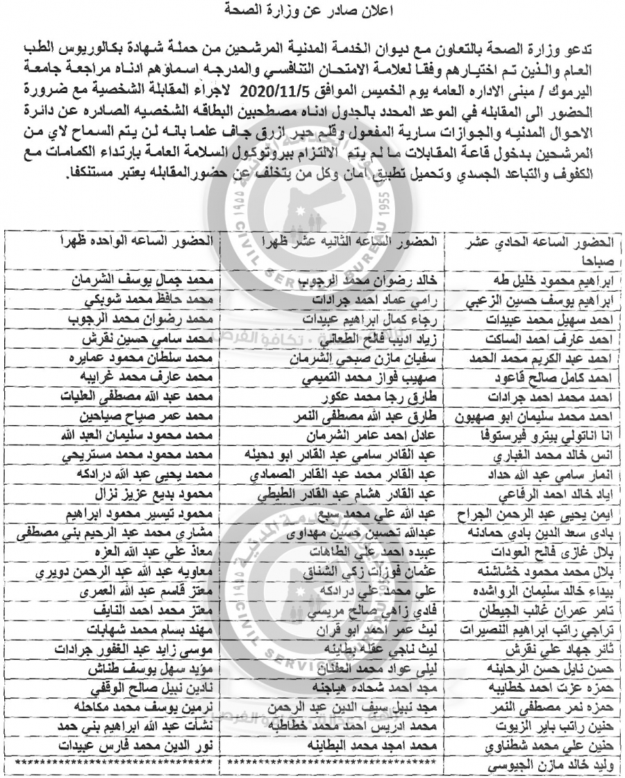 وكالة الناس – تدعو وزارة الصحة بالتعاون مع ديوان الخدمة المدنية المرشحين من حملة شهادة بكالوريوس الطب العام والذين تم اختيارهم وفقا لعلامة الامتحان التنافسي والمدرجة أسماؤهم أدناه مراجعة جامعة اليرموك / مبنى الاداره العامه يوم الخميس الموافق 2020/11/5 لاجراء المقابلة الشخصية مع ضرورة الحضور الى المقابلة في الموعد المحدد بالجدول أدناه مصطحبين البطاقة الشخصية الصادرة عن دائرة الأحوال المدنية والجوازات سارية المفعول و قلم حبر ازرق جاف علما بانه لن يتم السماح لاي من المرشحين بدخول قاعة المقابلات مالم يتم الالتزام ببروتوكول السلامة العامة بارتداء الكمامات مع الكفوف والتباعد الجسدي وتحميل تطبيق امان وكل من يتخلف عن حضور المقابله يعتبر مستنكفا ۔