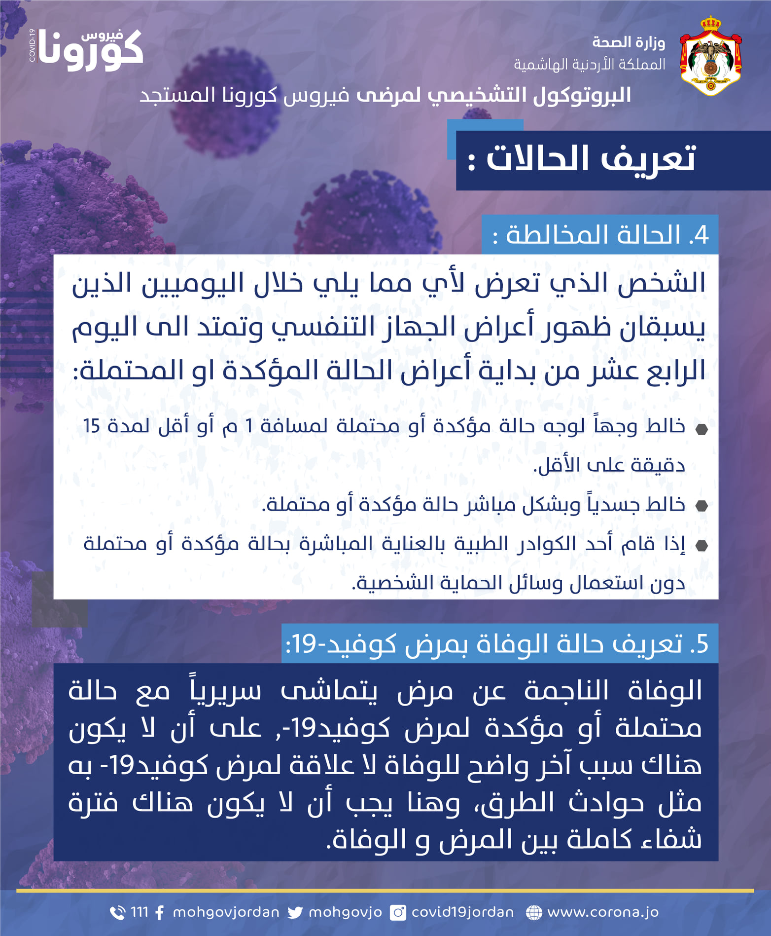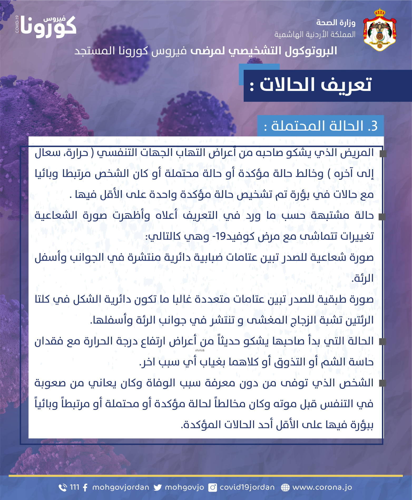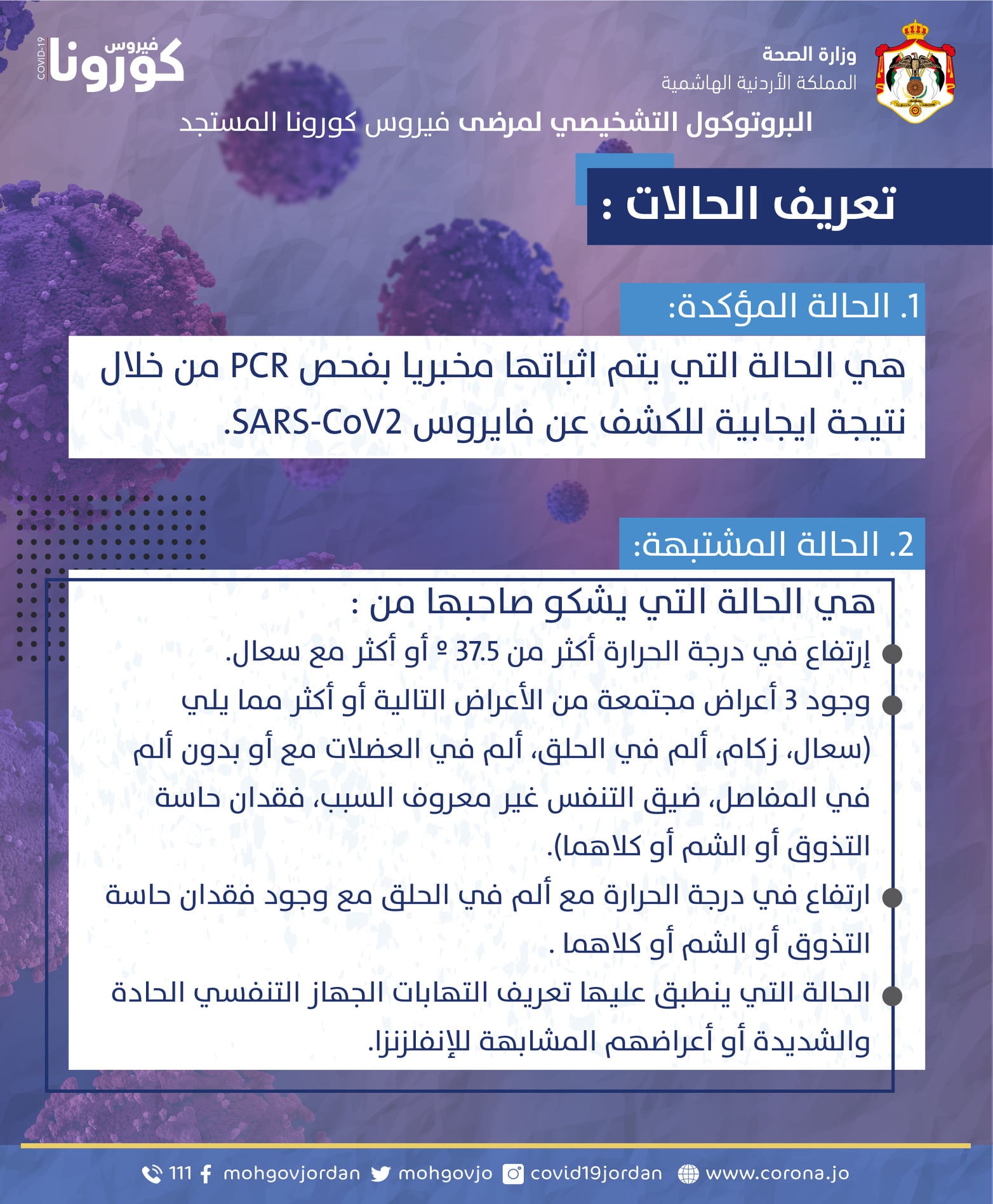 أما الحالة المحتملة، وفق ما توضح الوزارة، هي التي يشكو أصحابها من ارتفاع في الحرارة والسعال وخالطوا حالة مؤكدة أو محتملة، فيما الحالة المخالطة هي الشخص الذي خالط مريضا مؤكدا او محتملا لمسافة متر أو أقل لمدة 15 دقيقة، وخالط جسديا بشكل مباشر مصابا أو مصابا محتملا، أو أحد كوادر الطب قام بالعناية المباشرة بمصاب أو مصاب محتمل من دون وسائل الحماية.