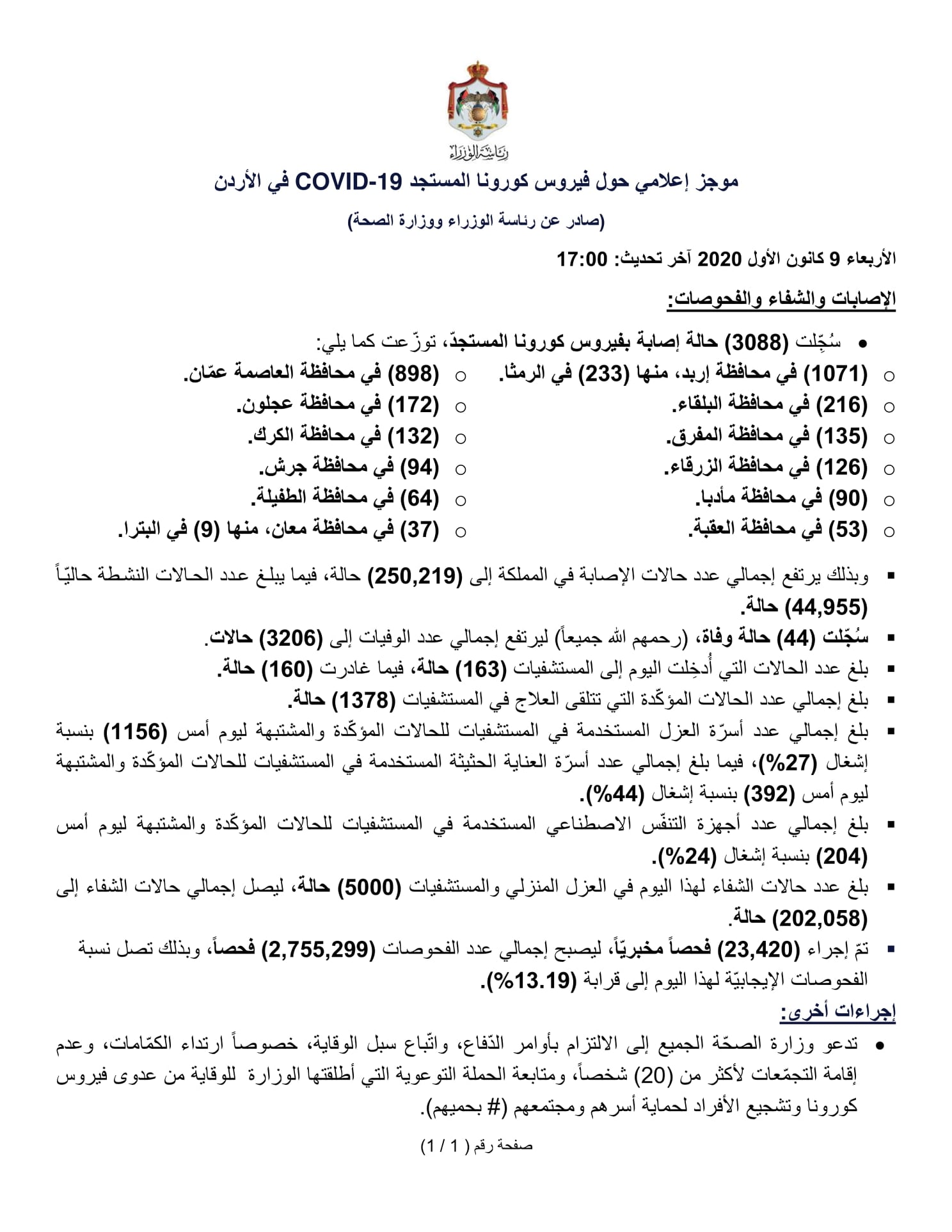 وكالة الناس – موجز إعلامي حول فيروس كورونا المستجد COVID-19 في الأردن (صادر عن رئاسة الوزراء ووزارة الصحة) الأربعاء 9 كانون الأول 2020.