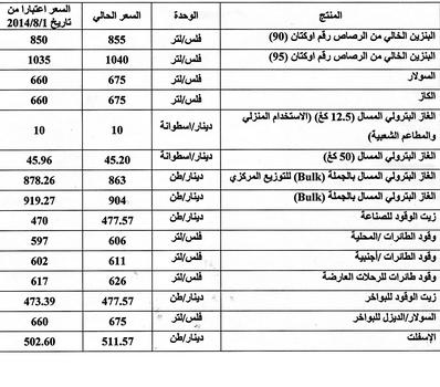 وكالة الناس – قرر وزير الصناعة والتجارة والتموين تعديل اسعار المشتقات النفطية اعتبارا من يوم غد الجمعة، الاول من آب لعام 2014 وعلى النحو التالي: البنزين الخالي من الرصاص رقم اوكتان (90)/ لتر 850 فلسا.