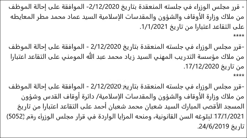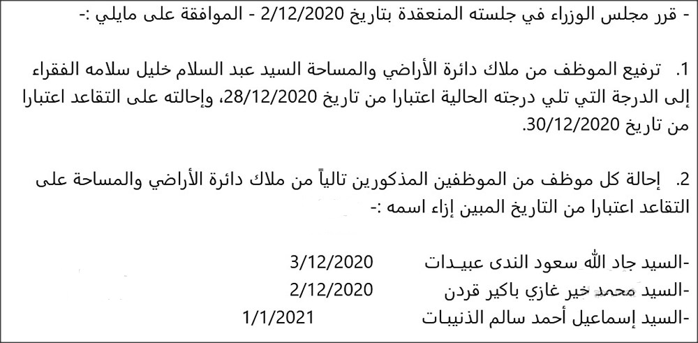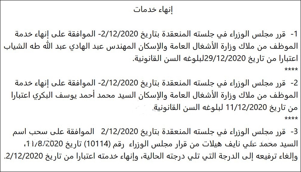 إنهاء خدمات وإحالة موظفين حكوميين للتقاعد (أسماء) On ديسمبر 16, 2020 Share قرر مجلس الوزراء إحالة موظفين في عدد من الوزارات والدوائر إلى التقاعد. كما قرر المجلس إنهاء خدمات موظفين آخرين. وتاليا الاسماء: