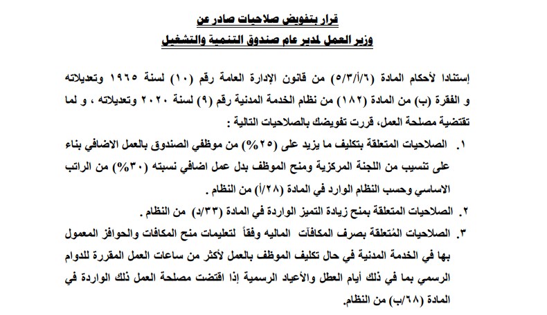 وكالة الناس – نشر في الجريدة الرسمية اليوم الاربعاء قراراً بتفويض صلاحيات صادرة عن وزير العمل ووزير الدولة لشؤون الاستثمار، الدكتور معن القطامين لمدير صندوق التنمية والتشغيل بالوكالة الدكتور قيس السفاسفة ، وتالياً التفاصيل: