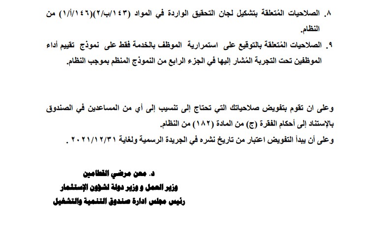 قطامين يفوض صلاحيات لـ “مدير عام صندوق التنمية والتشغيل”
