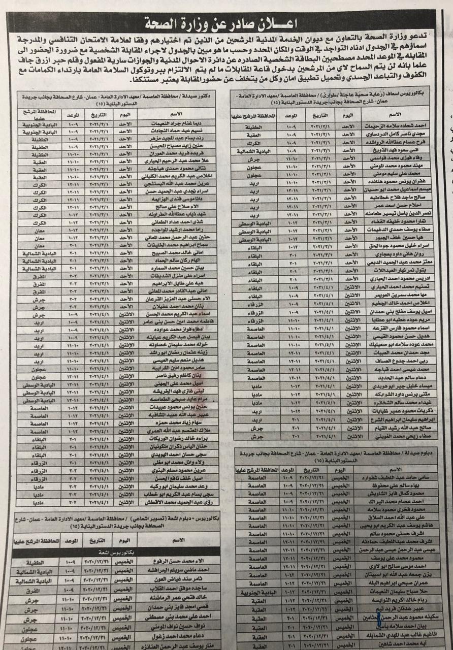 وكالة الناس – دعت وزارة الصحة بالتعاون مع ديوان الخدمة المدنية، المرشحين من الذين تم اختيارهم وفقا لعلامة الامتحان التنافسي والمدرجة أسماؤهم في الجدول ادناه التواجد والمكان المحدد لاجراء المقابلة الشخصية.