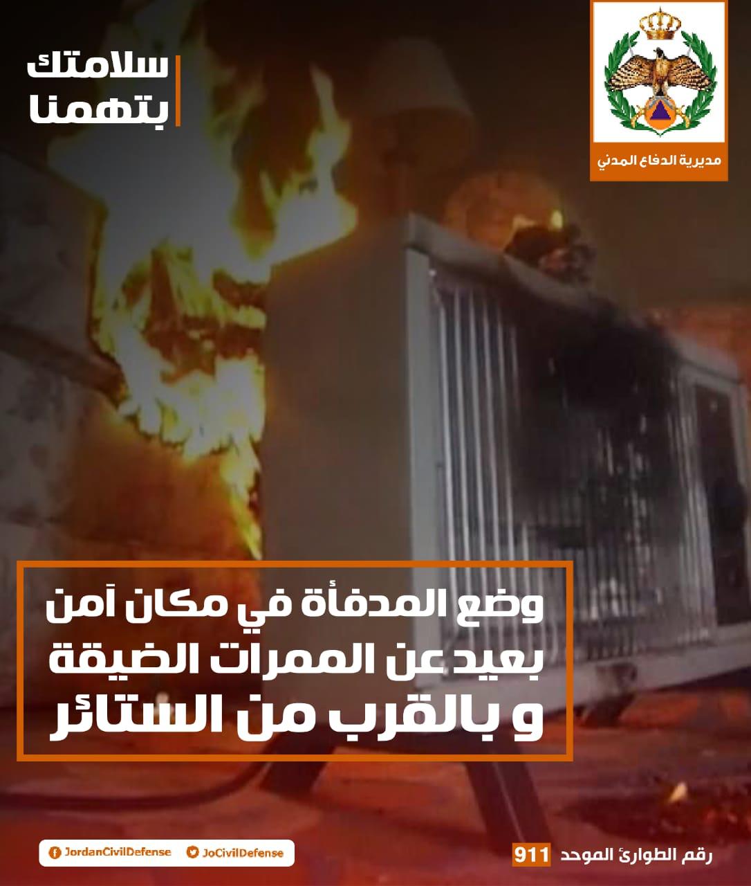 الدفاع المدني يحذر من وضع المدفأة في الممرات الضيقة (صورة) On يناير 2, 2021 Share وكالة الناس – وجهت المديرية العامة للدفاع المدني نصائح للمواطنين للتعامل الامن مع المدافاء في الممرات الضيقة. ودعت المديرية في إدراج لها على صفحتها على مواقع التواصل الاجتماعي إلى ضرورة وضع المدفأة في مكان أمن بعيد عن الممرات الضيقة والستائر.