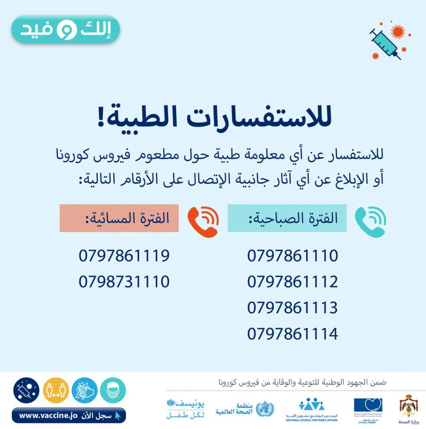 وكالة الناس – أعلنت وزارة الصحة، الثلاثاء، عن أرقام للاستفسار عن أي معلومة طبية حول لقاح فيروس كورونا أو الابلاع عن أي آثار جانبية للقاح.