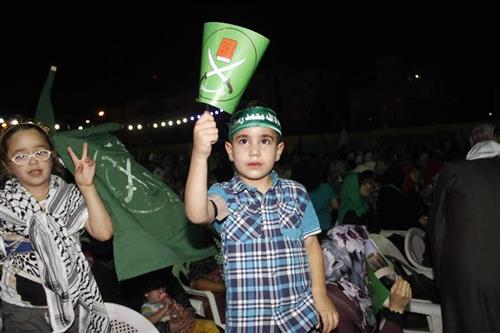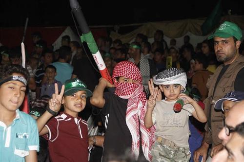 • مجموعة من الفتية الصغار تلثموا بالكوفيتان الحمراء والسوداء تيمناً بالنطاق باسم كتائب عز الدين القسام أبو عبيدة.