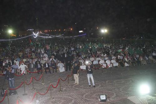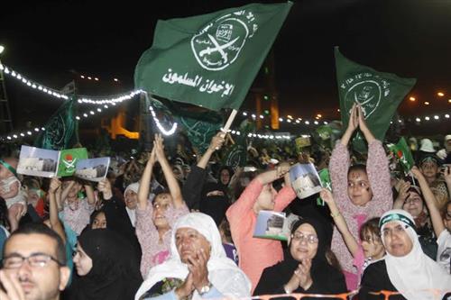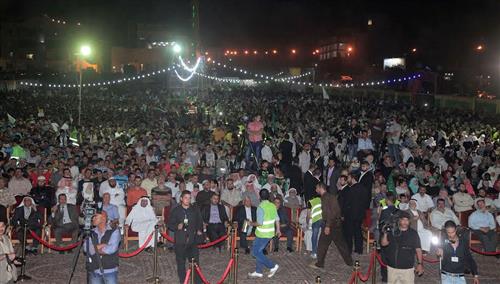 • قامت لجان النظام في المهرجان بتوزيع المياه وبعض السكاكر وأعلام صغيرة تحمل صورة المسجد القبلي وشعار الإخوان المسلمين على المشاركين.