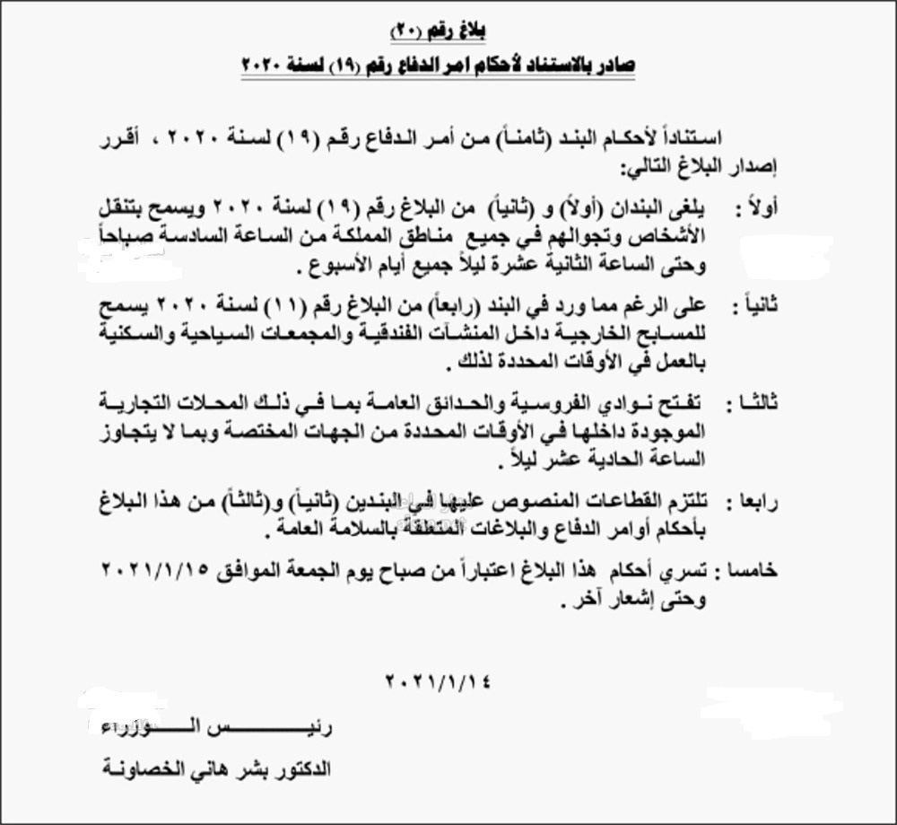 وكالة الناس – صدر مساء الخميس ، بلاغ رقم 20 صادر عن رئيس الوزراء، في الجريدة الرسمية.