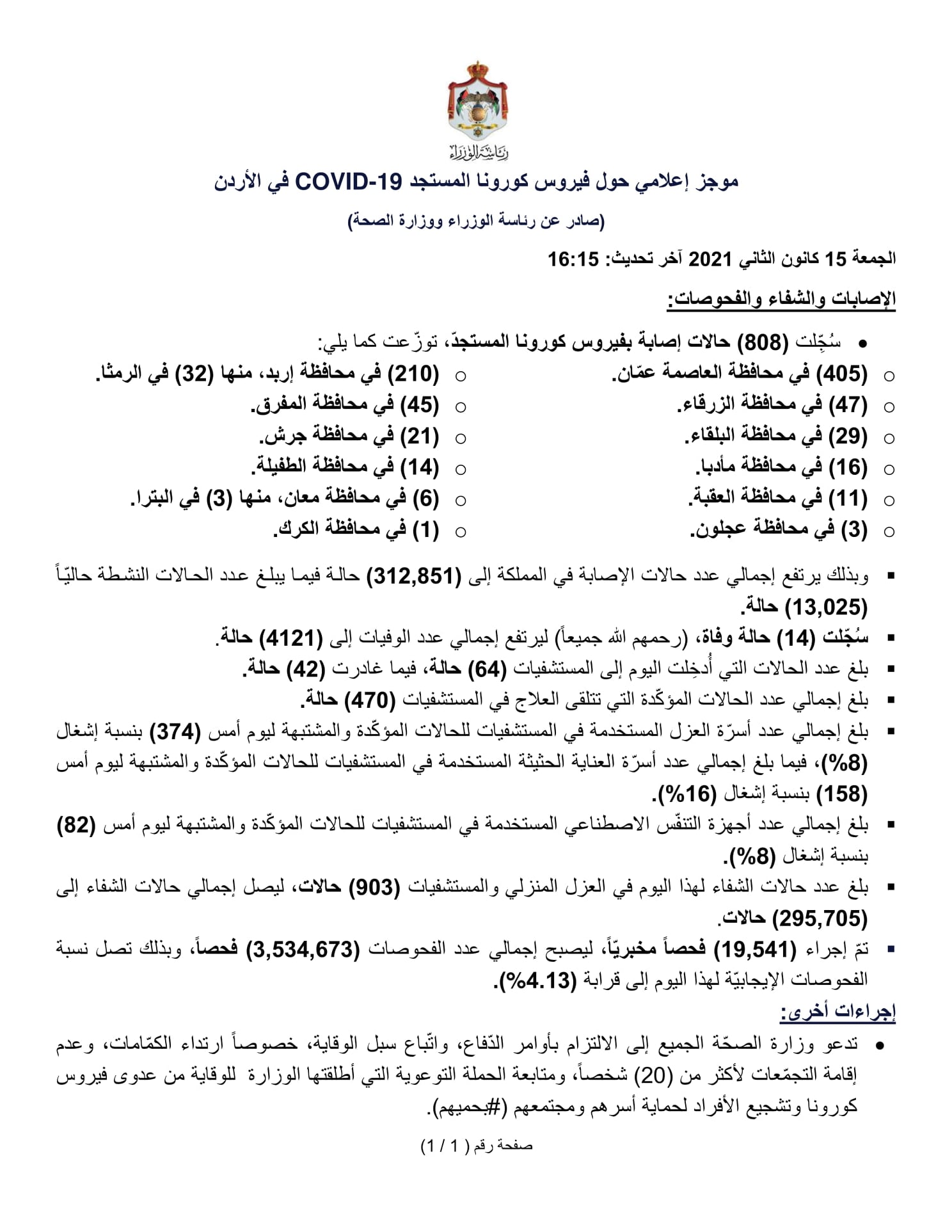 وكالة الناس – موجز إعلامي حول فيروس كورونا المستجد COVID-19 في الأردن (صادر عن رئاسة الوزراء ووزارة الصحة) الجمعة 15 كانون الثاني 2021.
