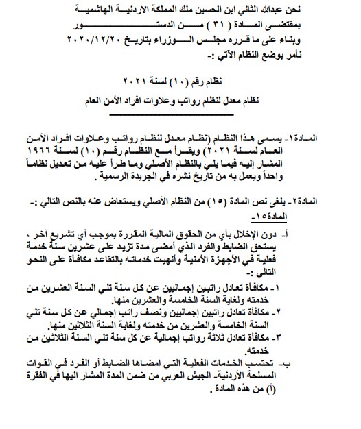 إرادة ملكية بنظام معدل لنظام رواتب وعلاوات افراد الأمن العام Last updated يناير 17, 2021 Share وكالة الناس – صدرت الإرادة الملكية بنظام معدل لنظام رواتب وعلاوات افراد الأمن العام وذلك بعد نشره في الجريدة الرسمية اليوم الاحد. وتالياً نص الإرادة: