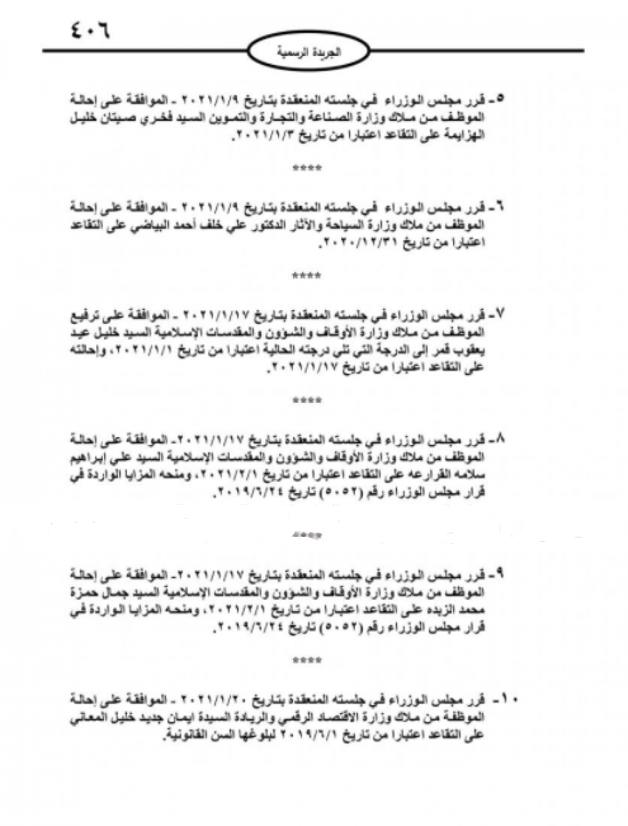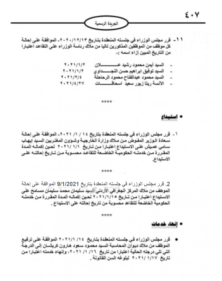 بالأسماء .. إحالات للتقاعد في رئاسة الوزراء وعدد من الدوائر الحكومية On فبراير 1, 2021 Share وكالة الناس – صدر في عدد الجريدة الرسمية اليوم الاثنين، قرارات مجلس الوزراء باحالة عدد من موظفي الدولة الى التقاعد، واحالة اخرين الى الاستيداع، وانهاء خدمات. وتاليا الاسماء: