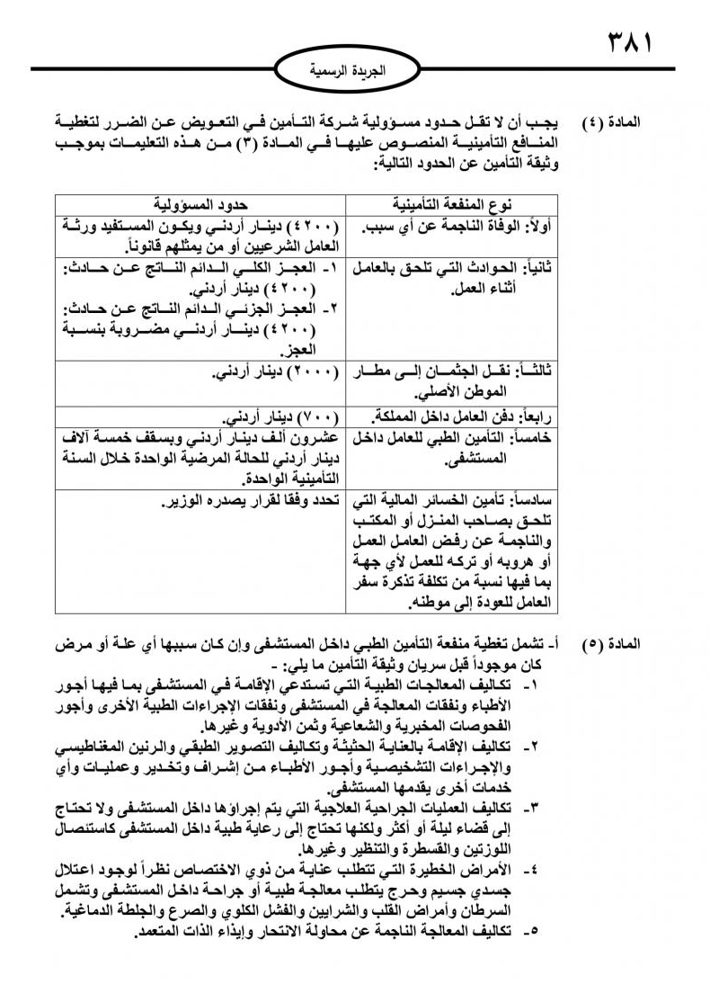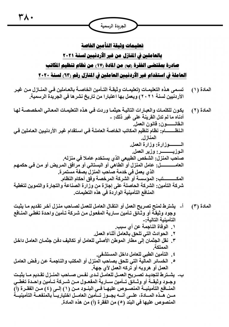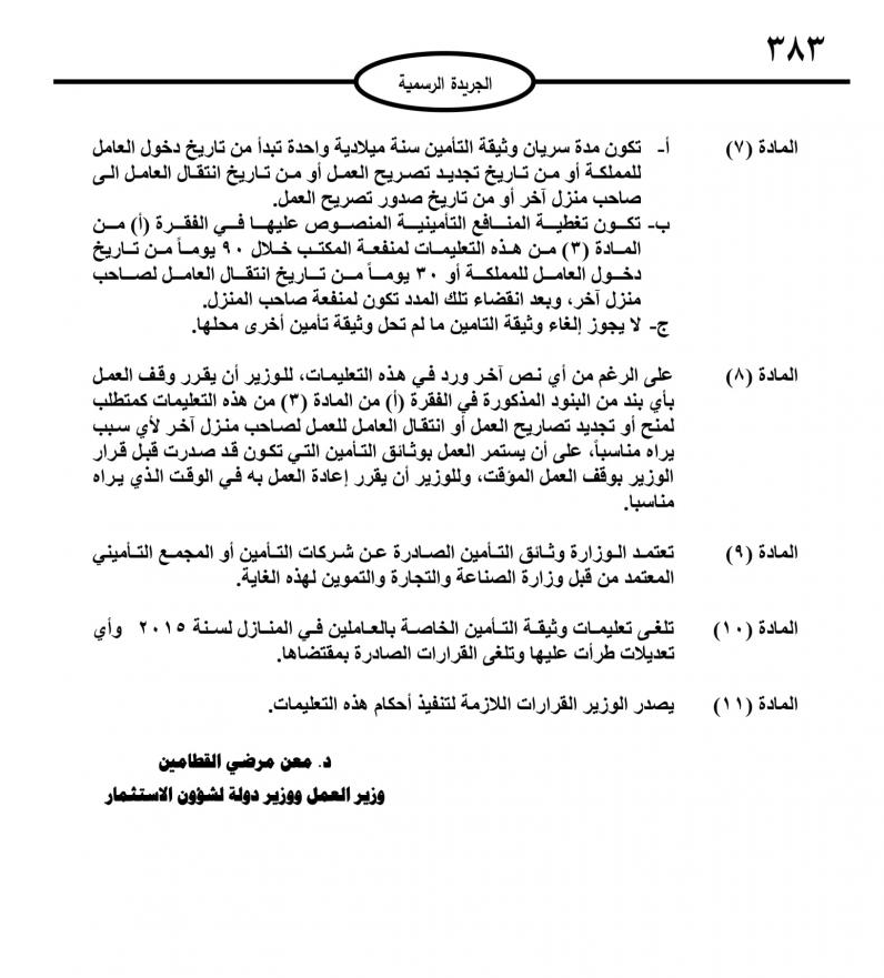 وكالة الناس – اصدر وزير العمل وشؤون الاستثمار الدكتور معن القطامين تعليمات وثيقة التأمين الخاصة بالعاملين في المنازل من غير الاردنين.