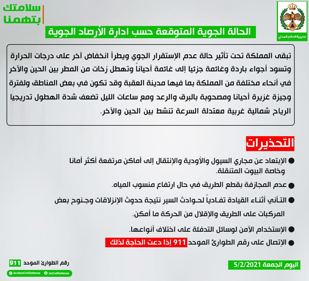 وكالة الناس – نشرت مديرية الدفاع المدني تحذيرات للمواطنين للتعامل مع الحالة الجوية المتوقعة الجمعة.