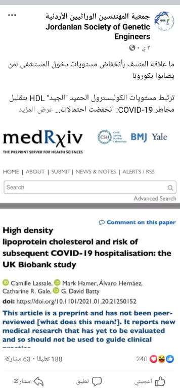 وقالت الجمعية في منشور لها على موقع “فيسبوك” إن مستويات الكوليسترول الحميد “الجيد” HDL والمتواجدة في الطعام مثل “المنسف” ترتبط بتقليل مخاطر COVID-19، حيث انخفضت احتمالات دخول المستشفى لـ COVID-19 بنسبة 9% مع كل 0.2 مليمول / لتر (حوالي 8 ملجم / ديسيلتر) في الكوليسترول الحميد HDL كما أثبتت دراسة علمية.