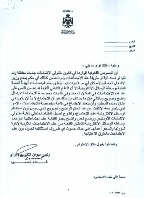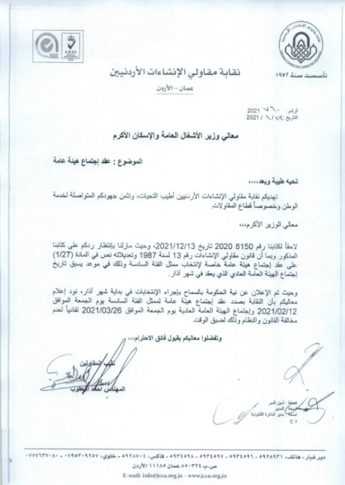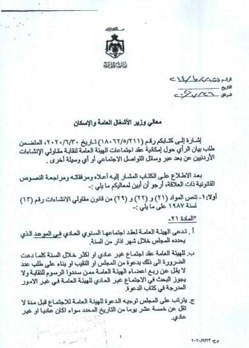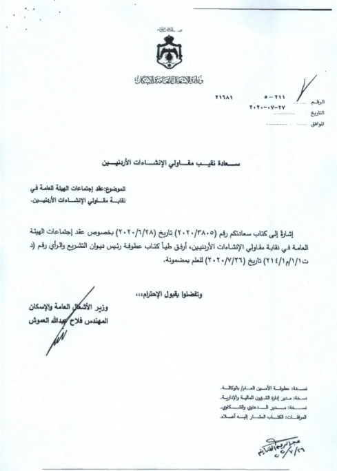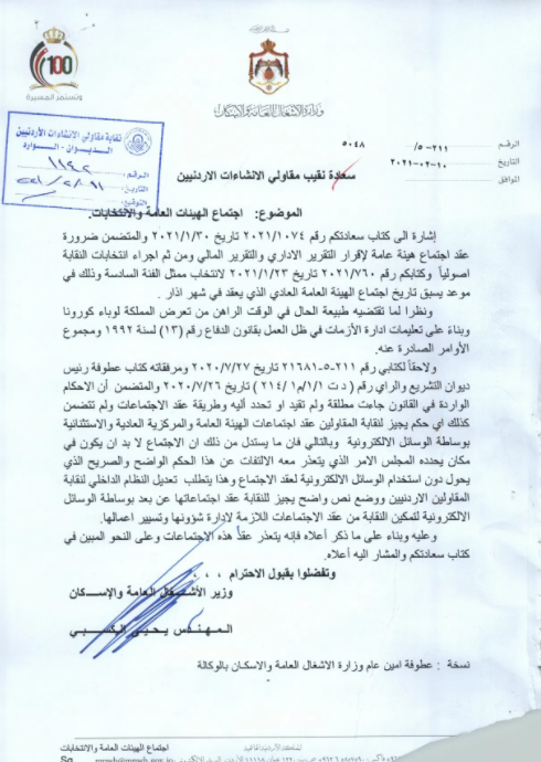 وكالة الناس – قال نقيب المقاولين احمد اليعقوب ان الحكومة ردت من خلال وزارة الاشغال العامة على طلب النقابة بالسماح لها بعقد اجتماع الهيئة العامة واجراء الانتخابات بانه يتعذر السماح بذلك في الوقت الحالي نظرا للوضع الوبائي، وحتى إشعار آخر.