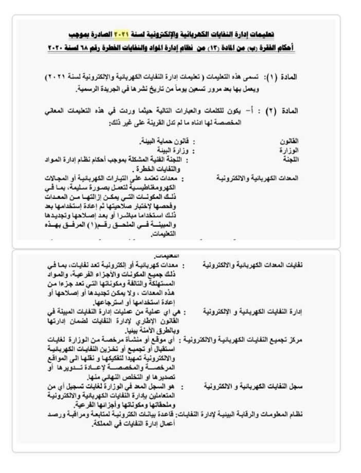 صدور تعليمات إدارة النفايات الكهربائية والإلكترونية On فبراير 16, 2021 Share وكالة الناس – أصدر وزير البيئة نبيل مصاروة، الثلاثاء، تعليمات إدارة النفايات الكهربائية والإلكترونية لسنة 2021، ويعمل بها بعد مرور 90 يوماً من تاريخ نشرها في الجريدة الرسمية. وتالياً نص التعليمات في الصور المرفقة: