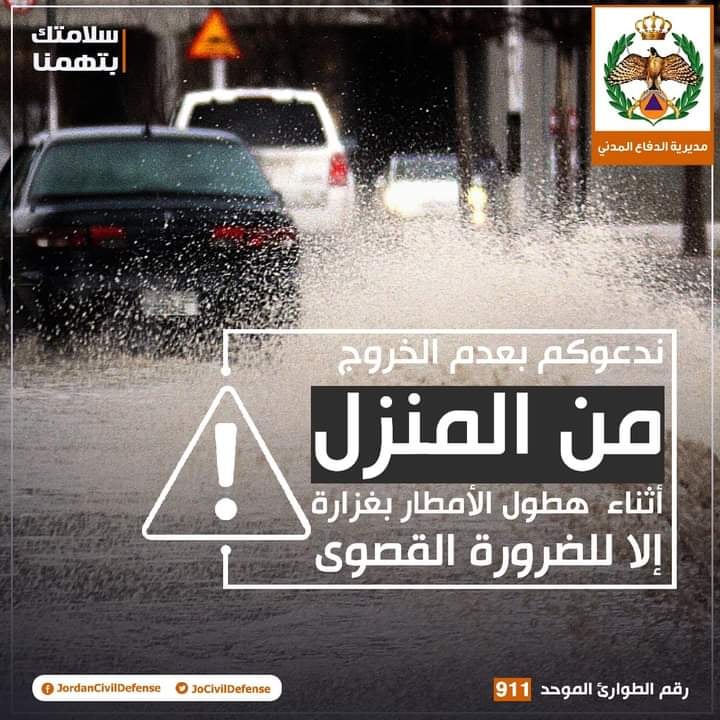 وكالة الناس – دعت مديرية الدفاع المدني لعدم الخروج من المنزل أثناء هطول الأمطار بغزارة إلا للضرورة القصوى.