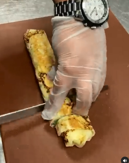 وبين المقطع عمل المنسف بطريقة اعتيادية في البداية، ثم وضعه داخل خبز الشراك ولفه وتقطيعه تماماً كما تقطع الشاورما، ثم يتم تزيينها باللحمة والخبز.