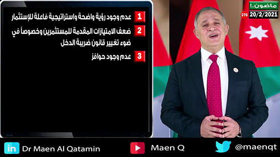 وشرح القطامين في الفيديو أهمية الاستثمار على الاقتصاد الاردني ، وقدم بعض الحلول والتوصيات لزيادة الساتمار في الأردن.