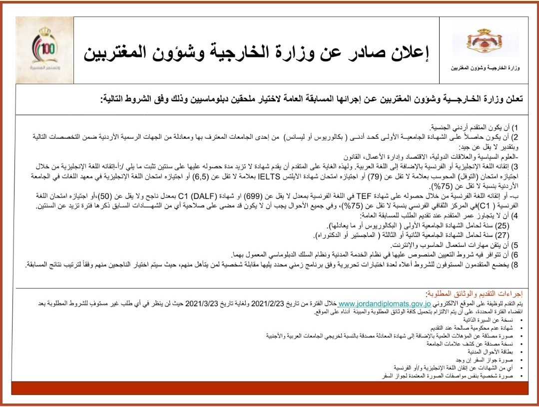 وكالة الناس – وزارة الخارجية تعلن عن مسابقة لتعيين ملحقين دبلوماسيين وفق هذه الشروط: