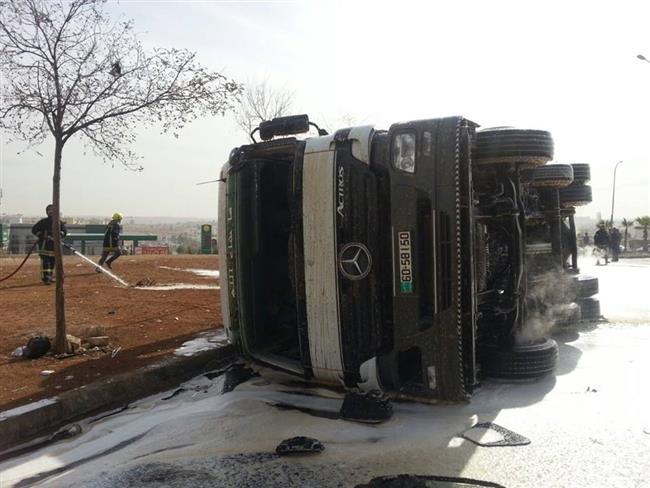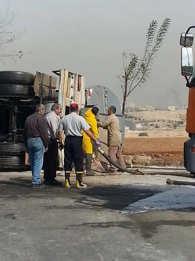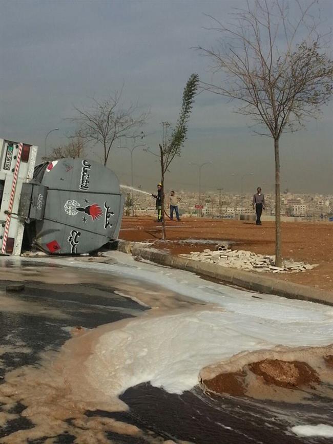 تدهور صهريج "فيول" على دوار الطيارة في الزرقاء "صور" Last updated Share وكالة الناس – أصيب سائق صهريج محمل بمادة البنزين، إثر تدهور صهريجه اليوم الثلاثاء في دوار مدينة الشرق (الطيارة) في الزرقاء.وقال مصدر أمني إن أفراد الأمن أغلقوا الطريق، للتعامل مع المادة المنسكبة من الصهريج، والتي وصفها بالخطيرة.