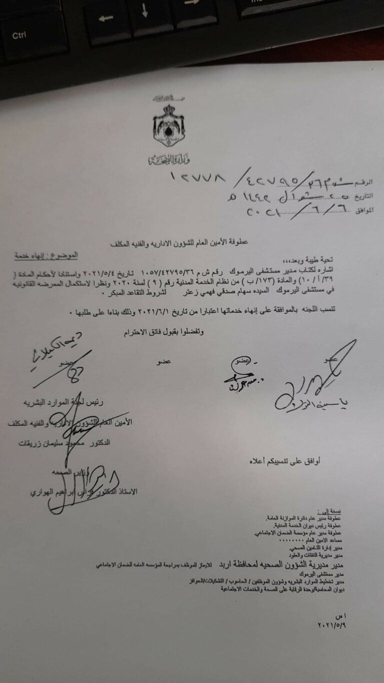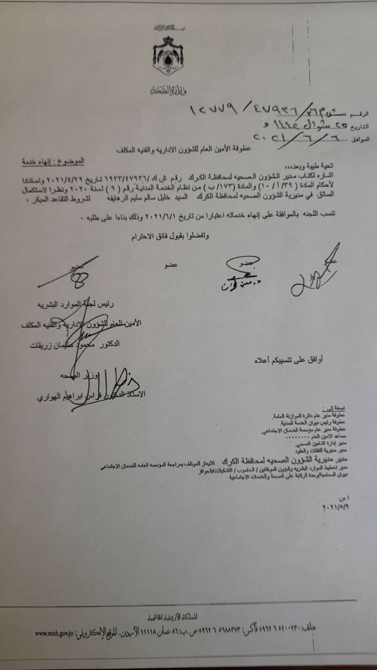 وكالة الناس – قرر وزير الصحة الدكتور فراس الهواري، إحالة عدد من موظفي الوزارة إلى التقاعد في مختلف المستشفيات، وبعضهم إلى التقاعد المبكر.