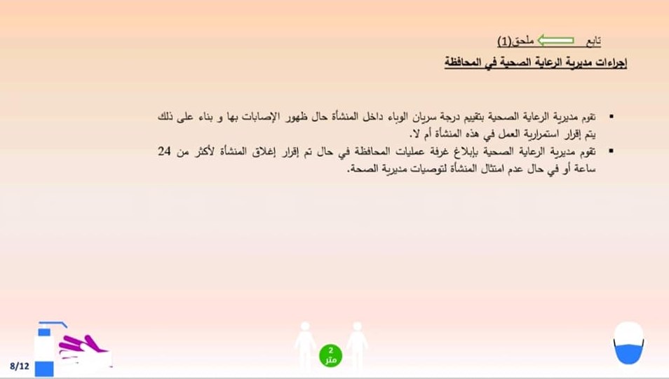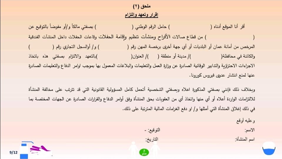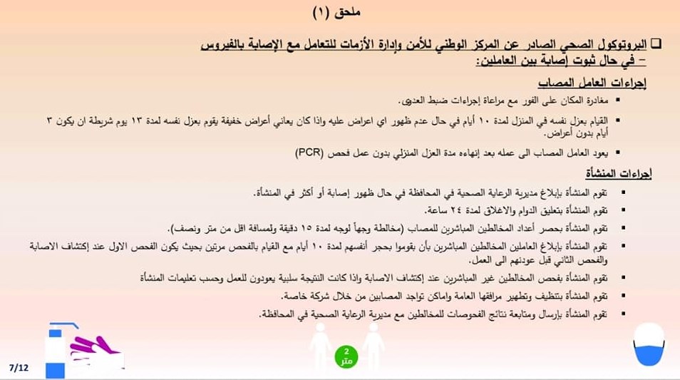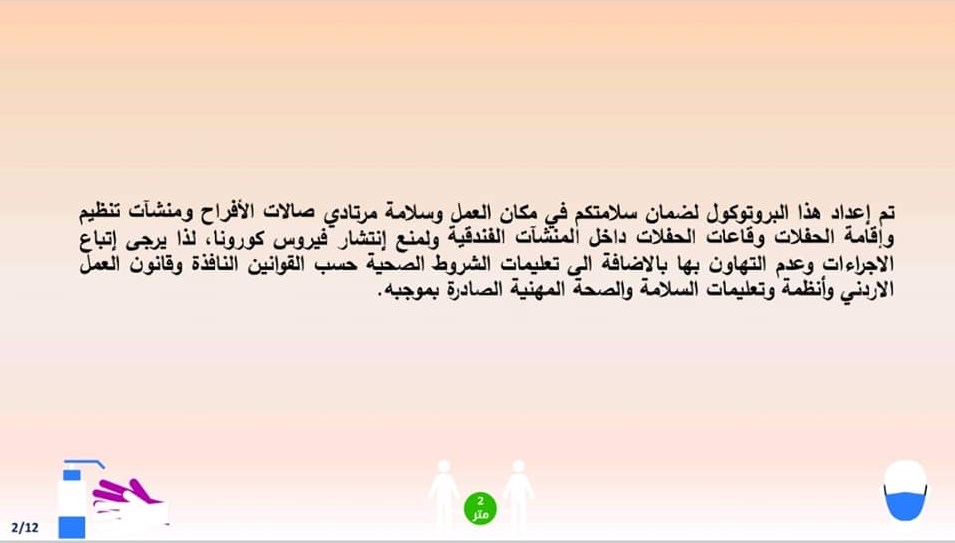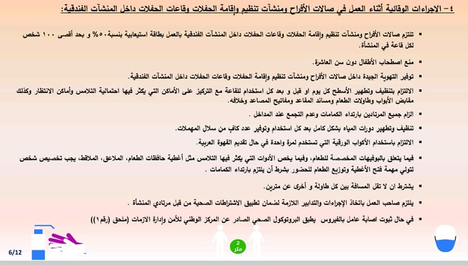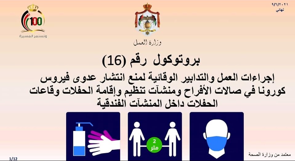 وكالة الناس – أصدرت وزارة العمل البروتوكول رقم 16 والذي يتضمن اجراءات العمل والتدابير الوقائية لمنع انتشار عدوى فيروس كورونا في صالات الأفراح ومنشآت تنظيم وإقامة الحفلات وقاعات الحفلات داخل المنشآت الفندقية. وتالياً التفاصيل: