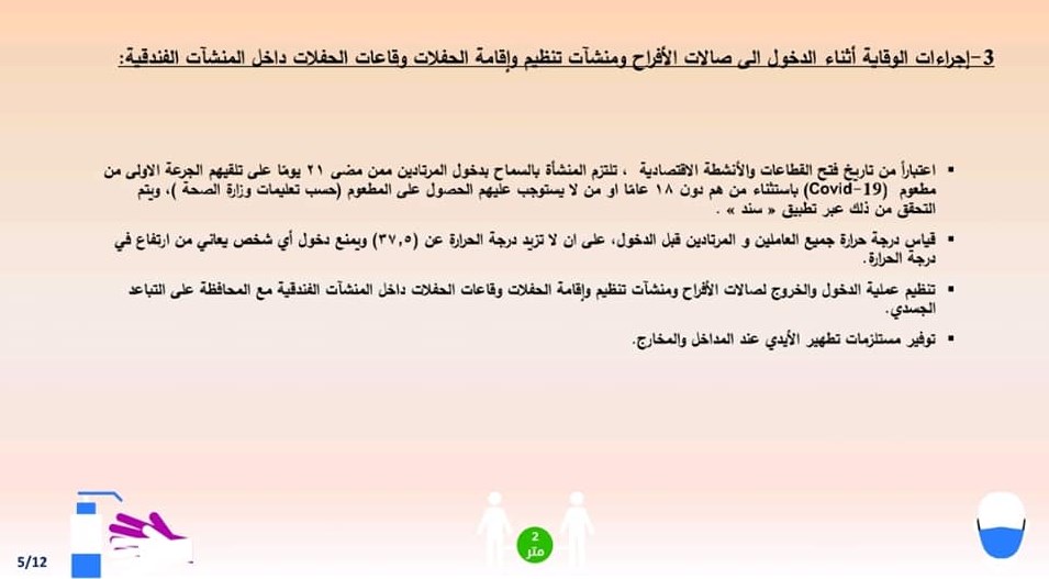 هذا ماذا جاء في بروتوكول رقم 16 … شاهد On يوليو 1, 2021 Share وكالة الناس – أصدرت وزارة العمل البروتوكول رقم 16 والذي يتضمن اجراءات العمل والتدابير الوقائية لمنع انتشار عدوى فيروس كورونا في صالات الأفراح ومنشآت تنظيم وإقامة الحفلات وقاعات الحفلات داخل المنشآت الفندقية. وتالياً التفاصيل: