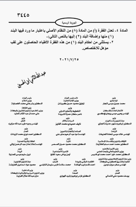 صدور نظام ألقاب المهنة والاختصاص للأطباء On أغسطس 19, 2021 Share وكالة الناس – صدر في عدد الجريدة الرسمية اليوم الخميس الارادة الملكية السامية بالنظام المعدل لنظام ألقاب المهنة والاختصاص للأطباء، نظام رقم (75) لسنة 2021. وتاليا النظام: