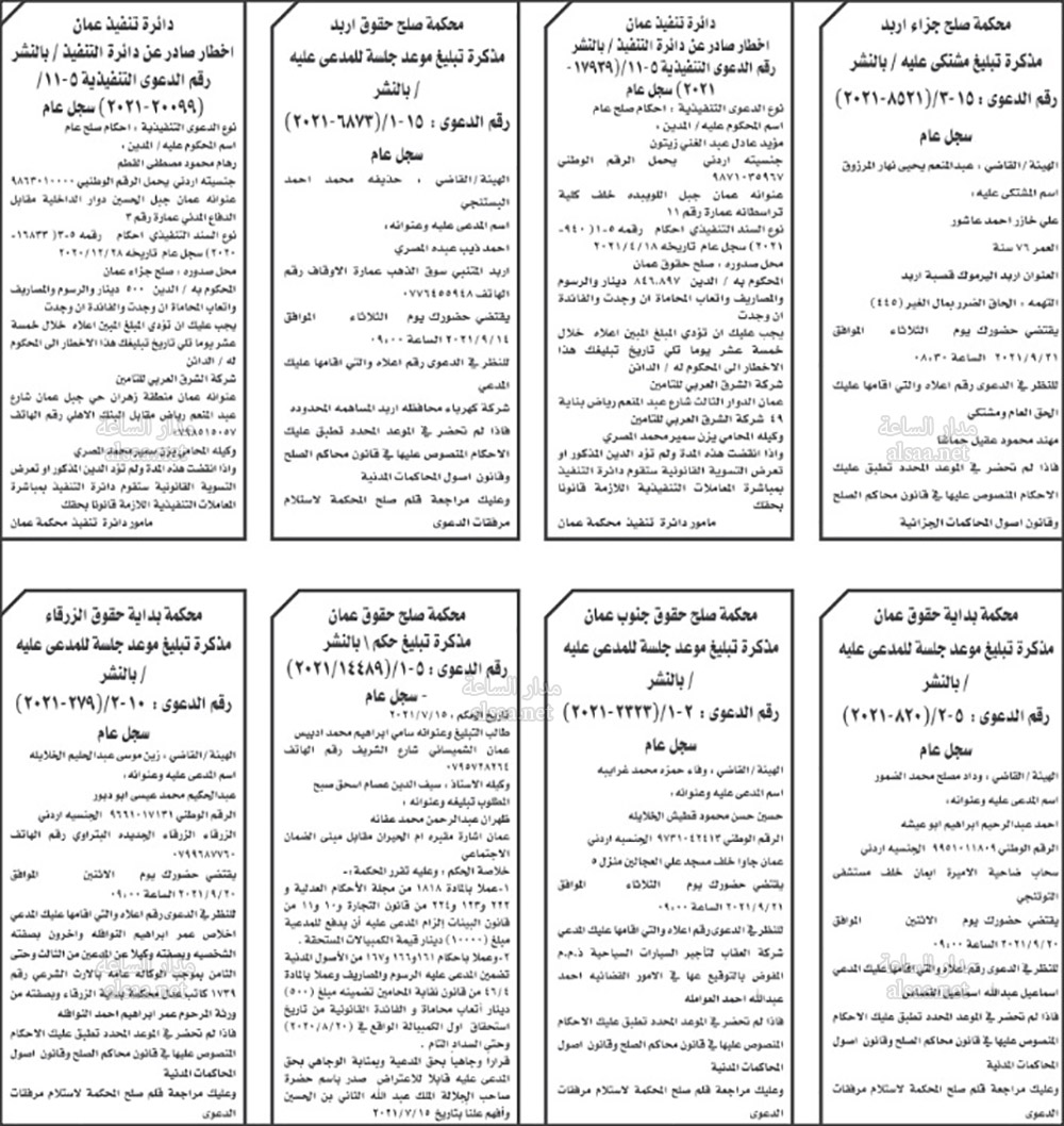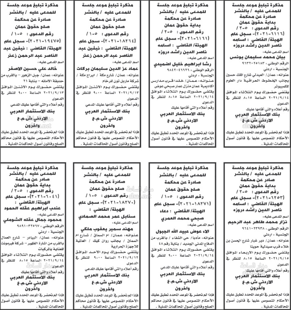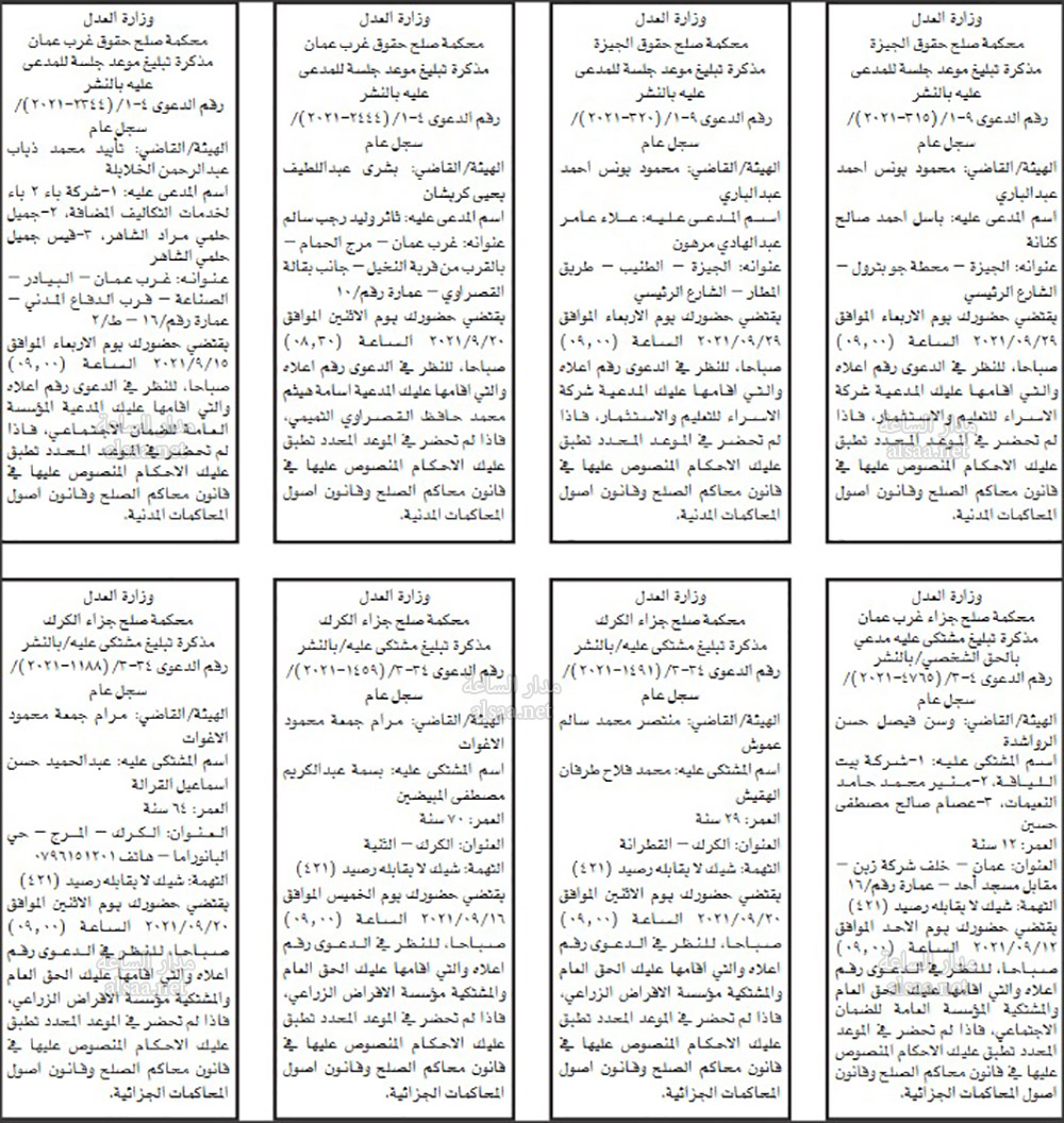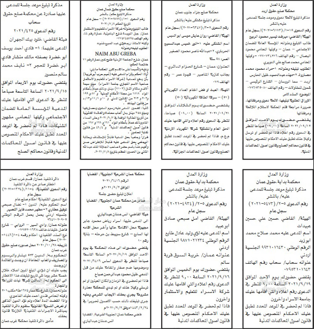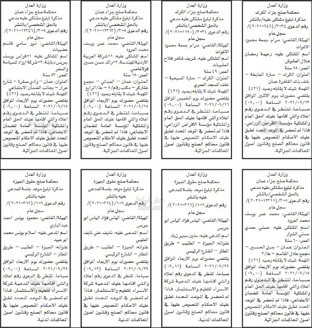 وكالة الناس – أعلنت محاكم الاربعاء عن مذكرات تبليغ مواعيد جلسات المحاكمة للمشتكى عليهم المذكورين تاليا.