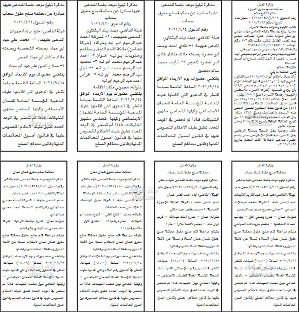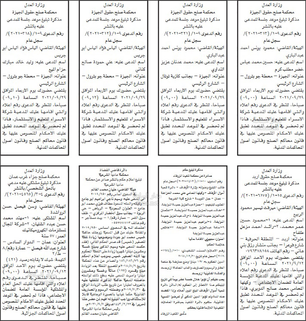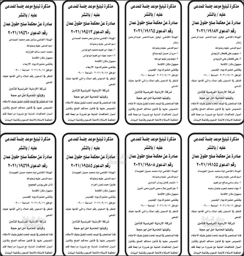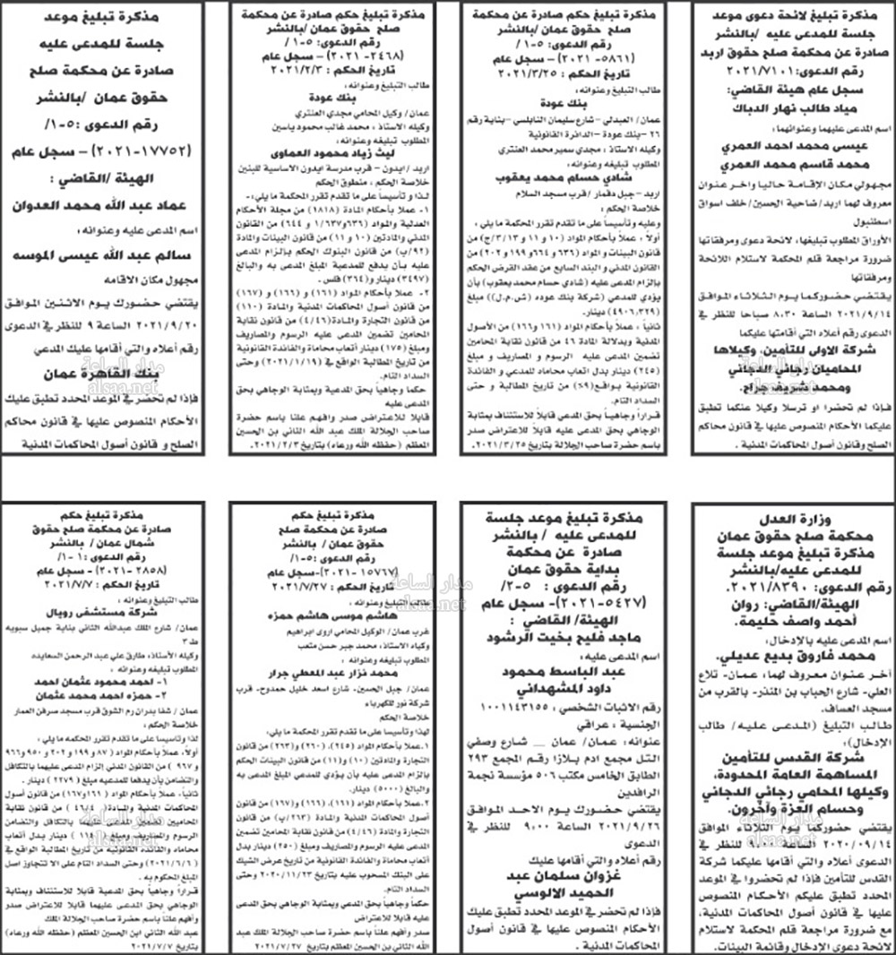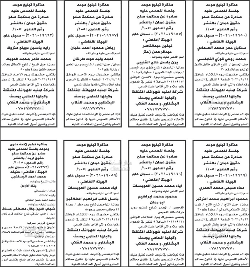 وكالة الناس – أعلنت محاكم الاربعاء عن مذكرات تبليغ مواعيد جلسات المحاكمة للمشتكى عليهم المذكورين تاليا.