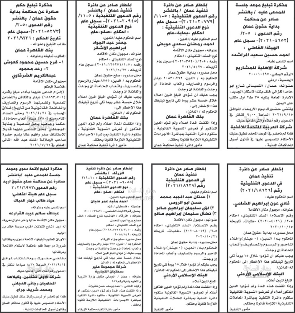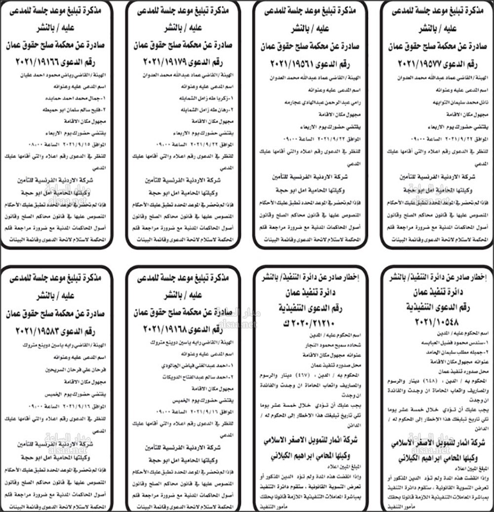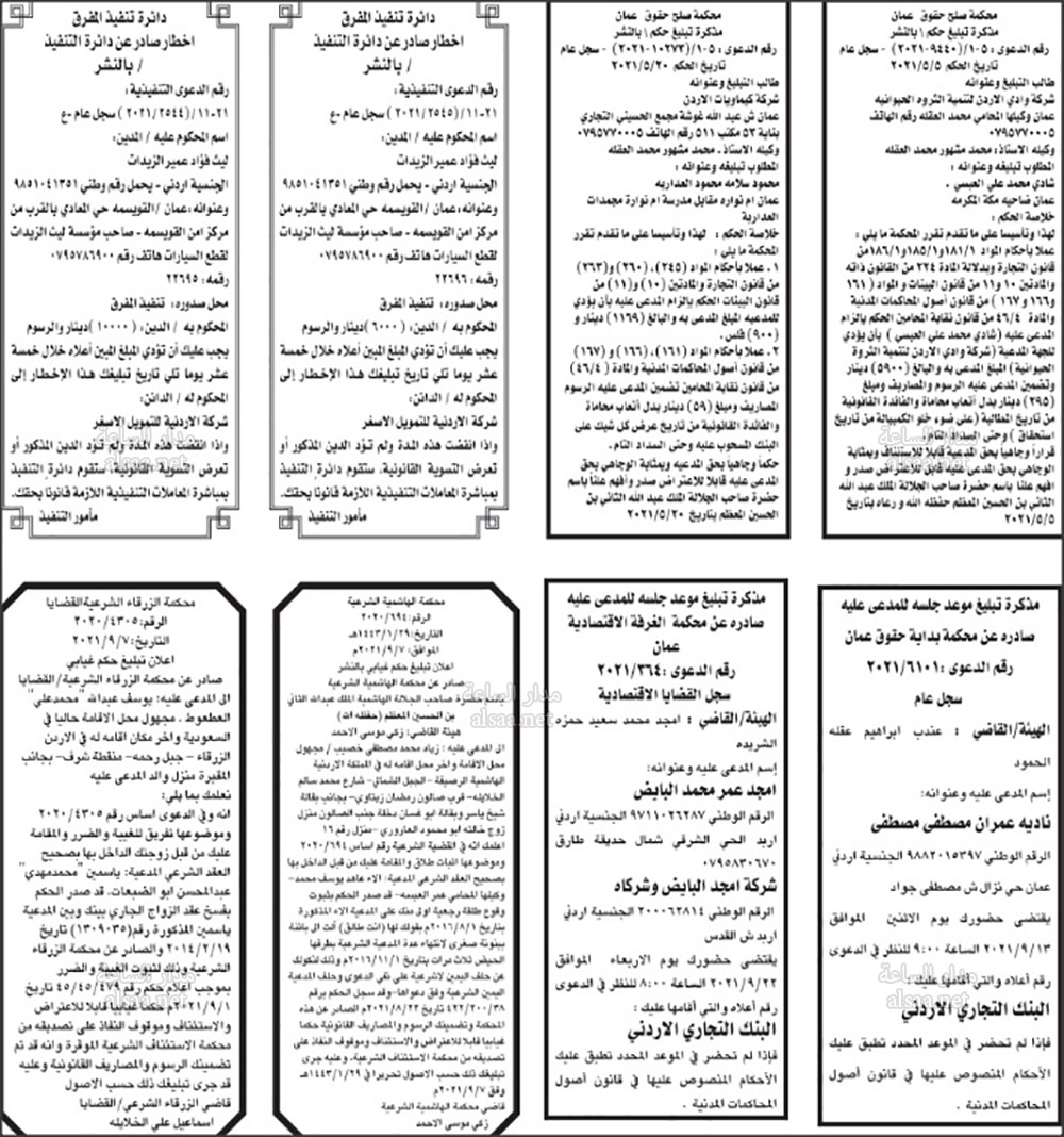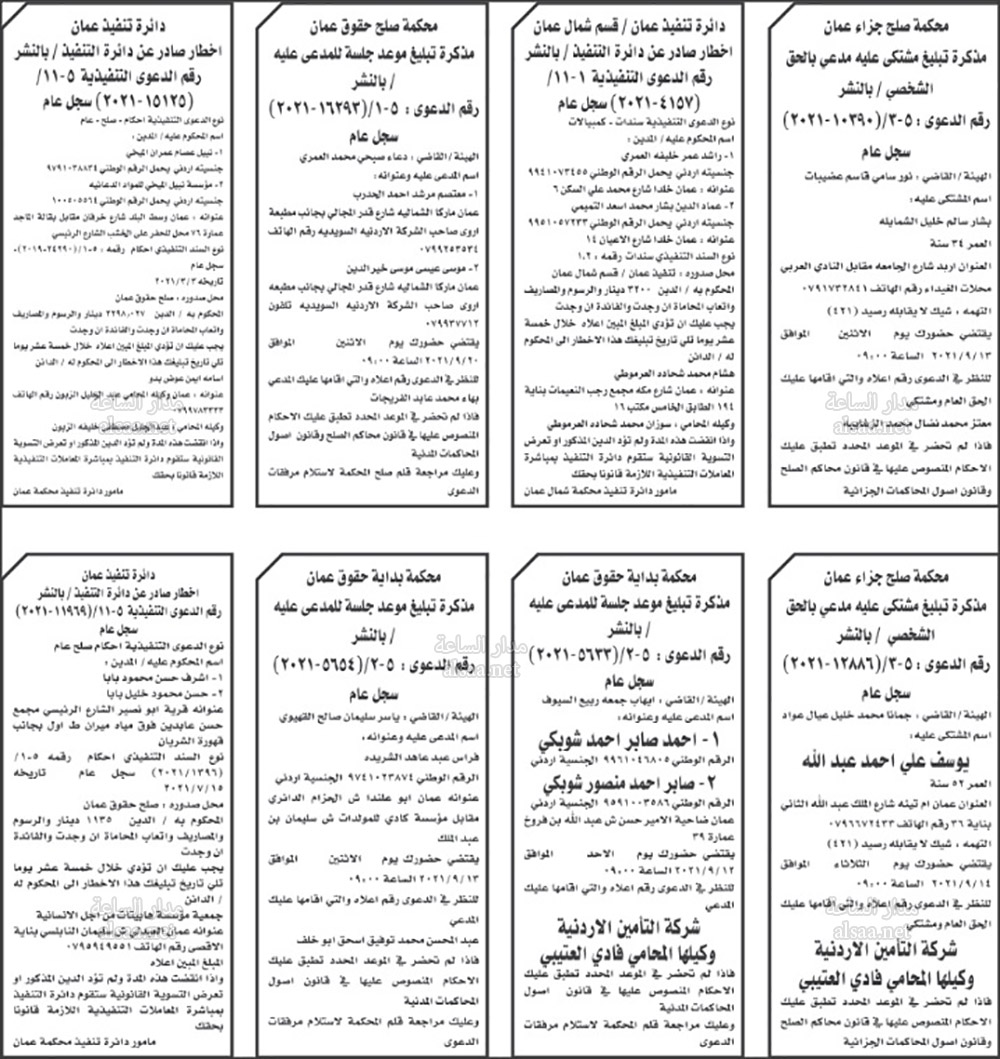 وكالة الناس – أعلنت محاكم الاربعاء عن مذكرات تبليغ مواعيد جلسات المحاكمة للمشتكى عليهم المذكورين تاليا.
